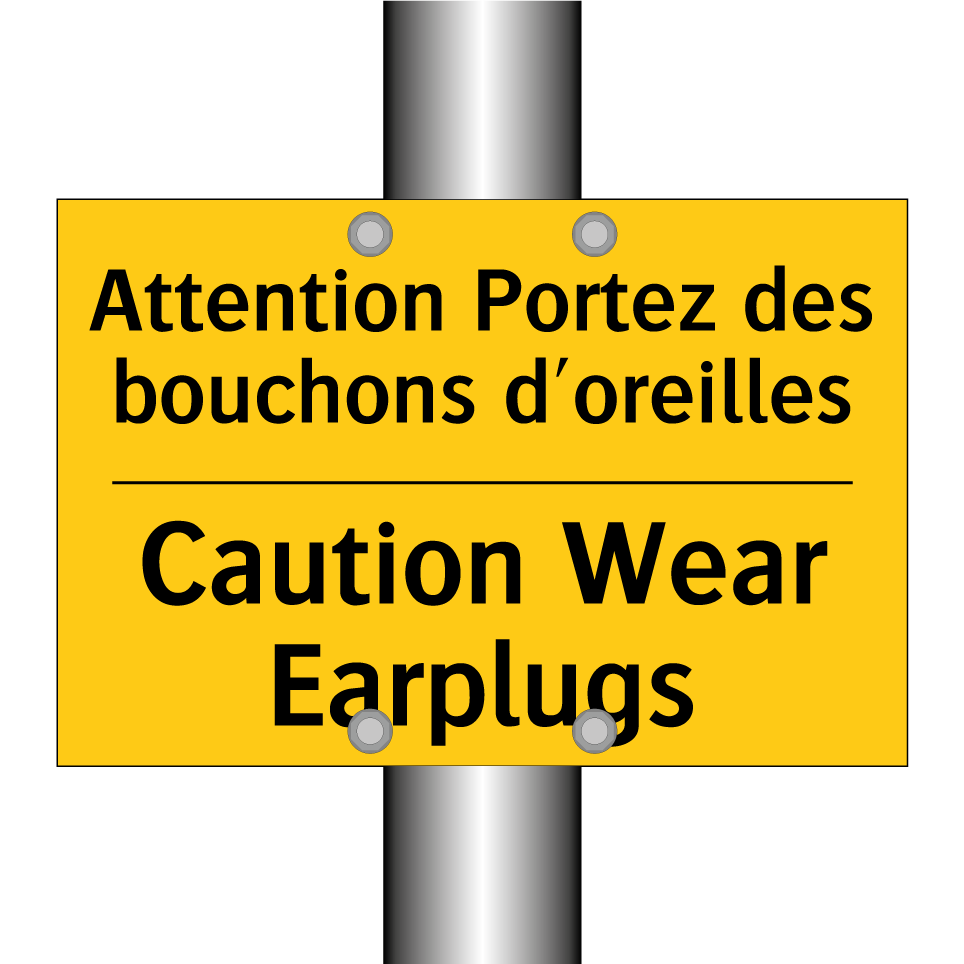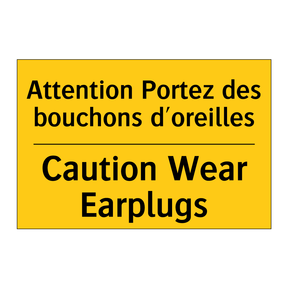 Panneau d'avertissement bilingue avec texte en français : "Attention Portez des bouchons d'oreilles", et en anglais : "Caution Wear Earplugs"