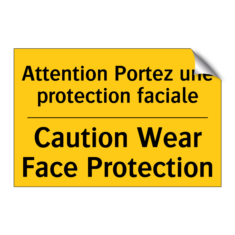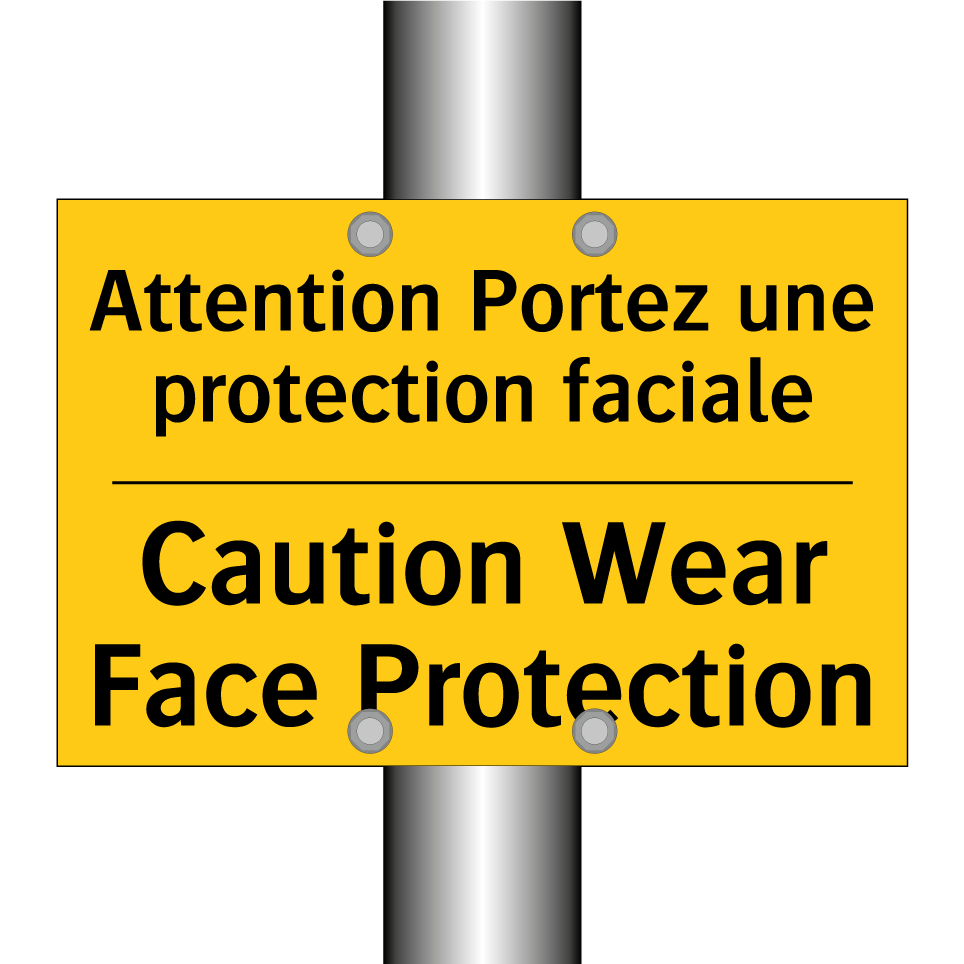 Panneau d'avertissement bilingue avec texte en français : "Attention Portez une protection faciale", et en anglais : "Caution Wear Face Protection"