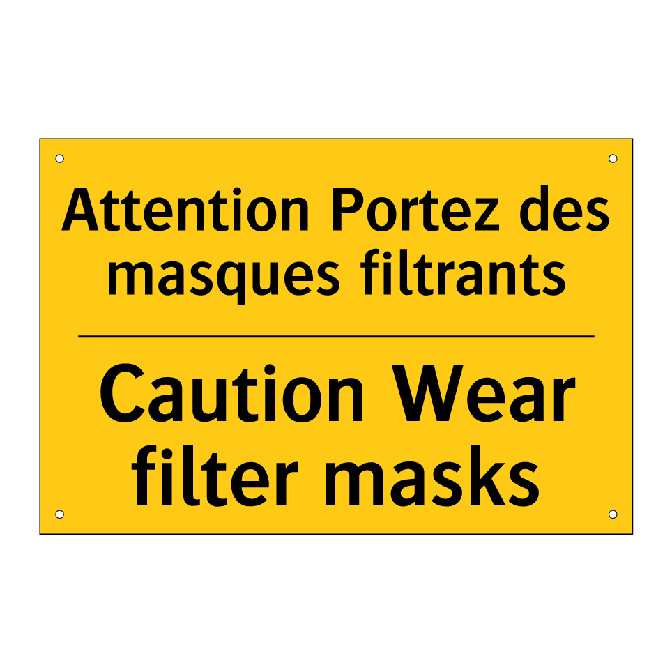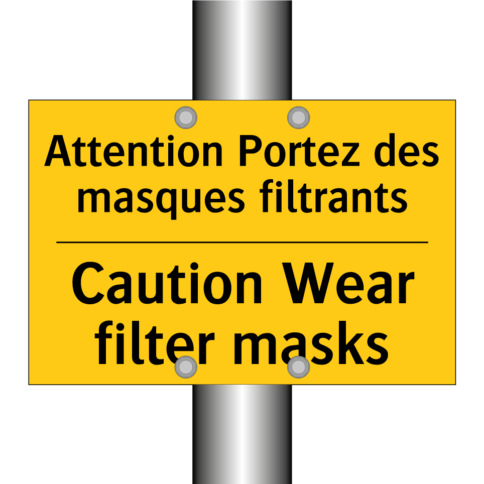 Panneau d'avertissement bilingue avec texte en français : "Attention Portez des masques filtrants", et en anglais : "Caution Wear filter masks"