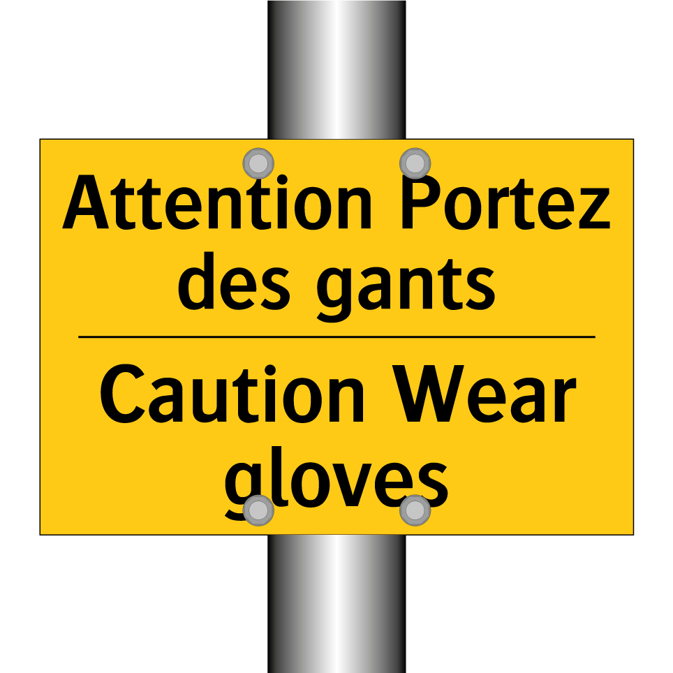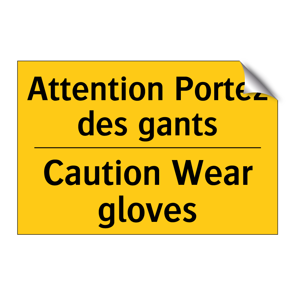 Panneau d'avertissement bilingue avec texte en français : "Attention Portez des gants", et en anglais : "Caution Wear gloves"