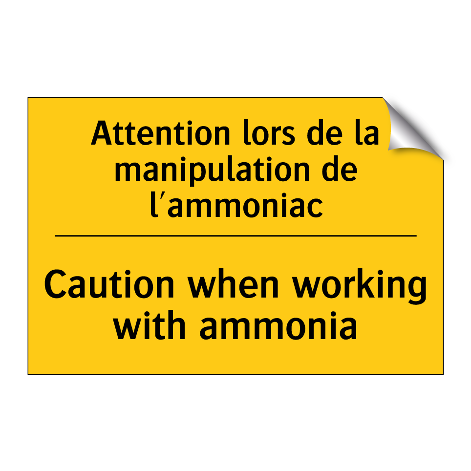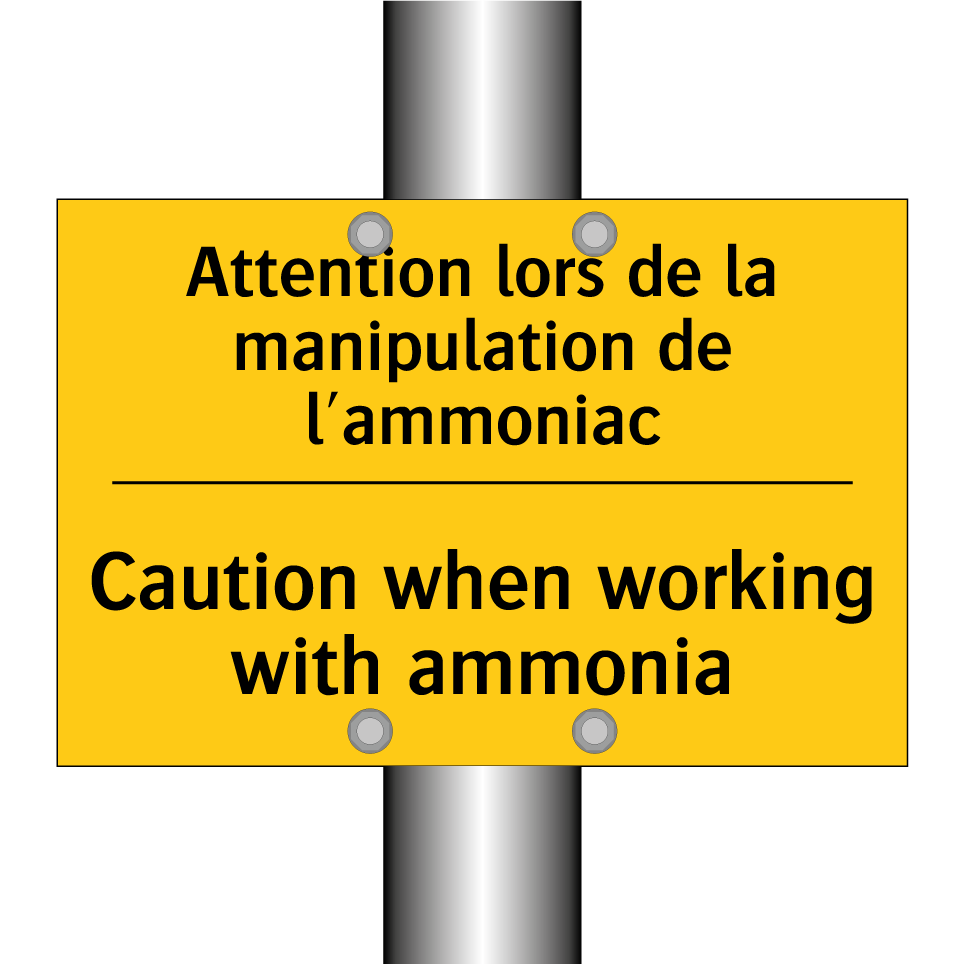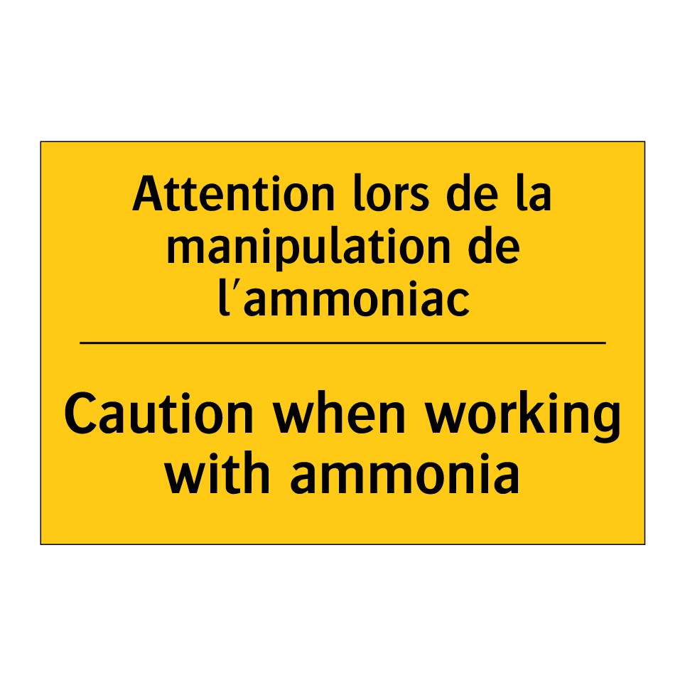 Panneau d'avertissement bilingue avec texte en français : "Attention lors de la manipulation de l'ammoniac", et en anglais : "Caution when working with ammonia"