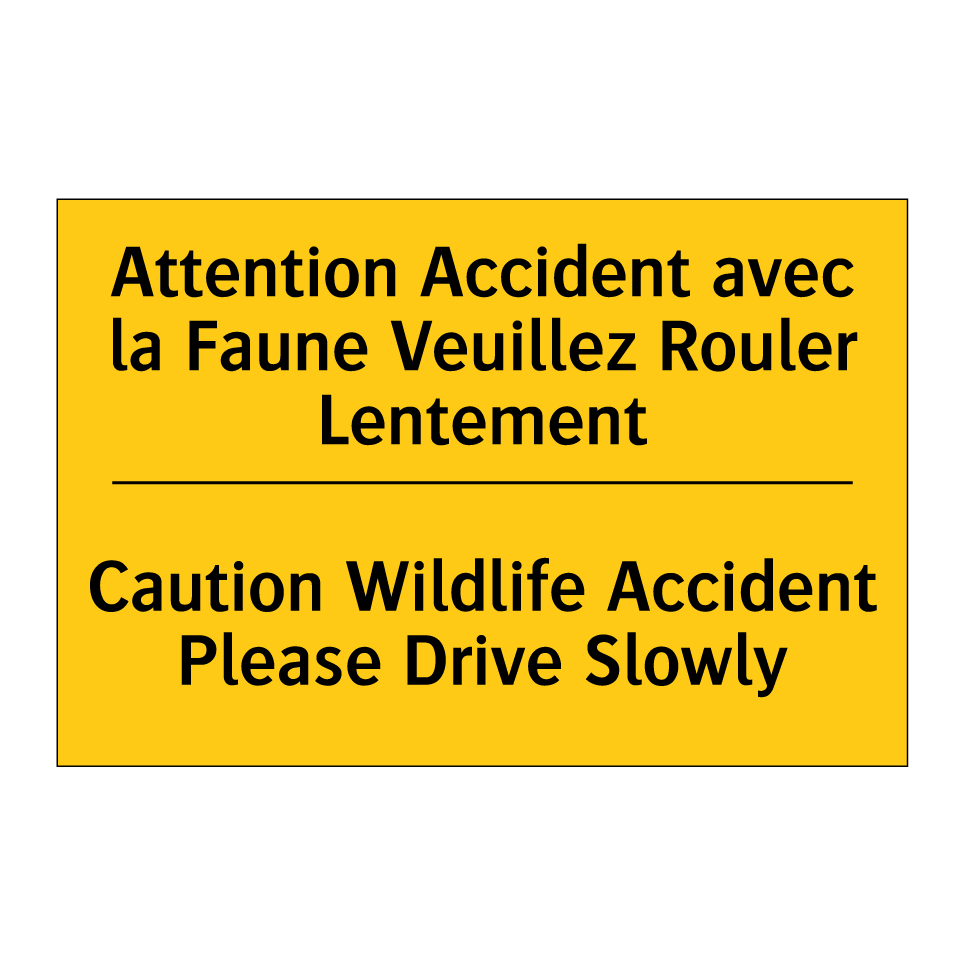 Panneau d'avertissement bilingue avec texte en français : "Attention Accident avec la Faune Veuillez Rouler Lentement", et en anglais : "Caution Wildlife Accident Please Drive Slowly"