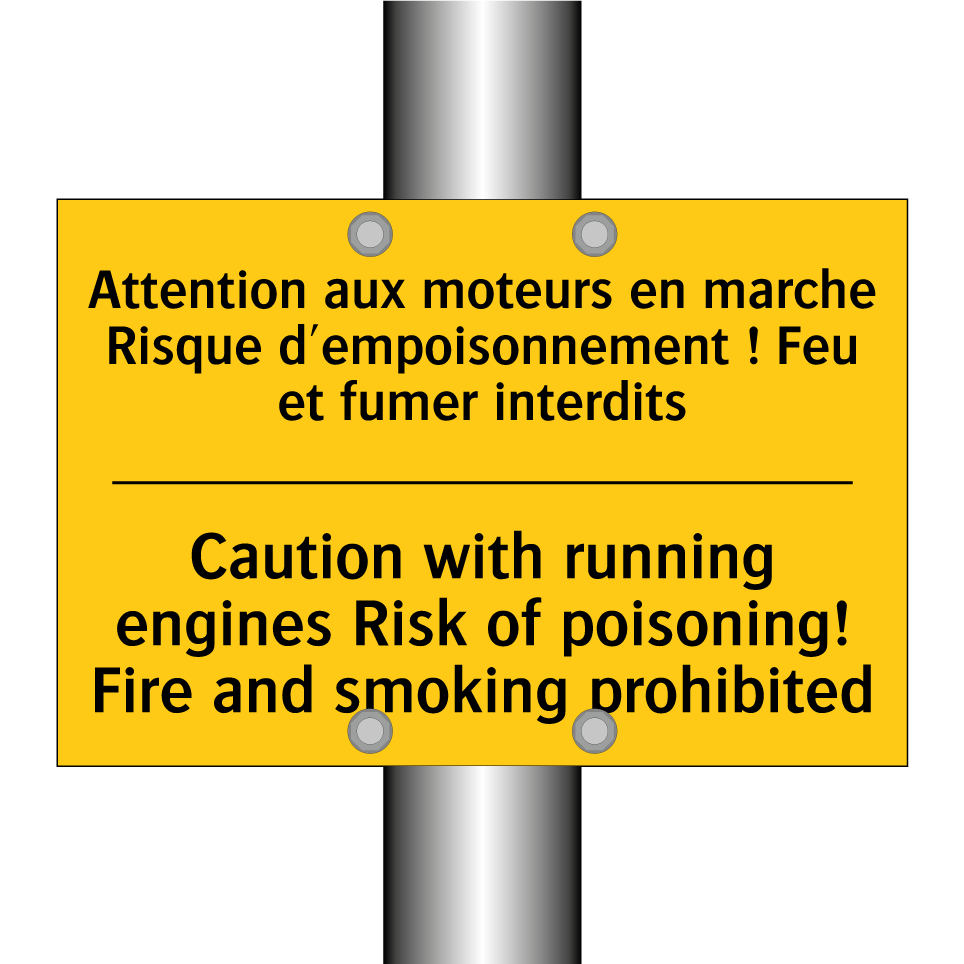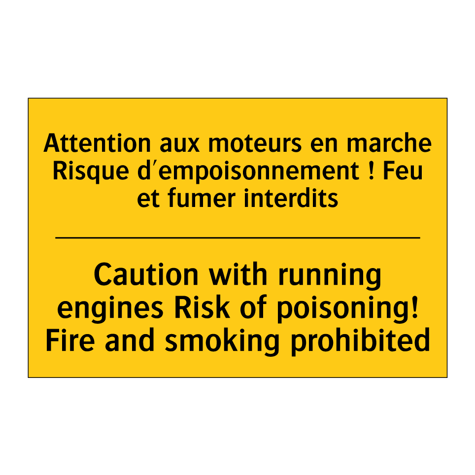 Panneau d'avertissement bilingue avec texte en français : "Attention aux moteurs en marche Risque d'empoisonnement ! Feu et fumer interdits", et en anglais : "Caution with running engines Risk of poisoning! Fire and smoking prohibited"