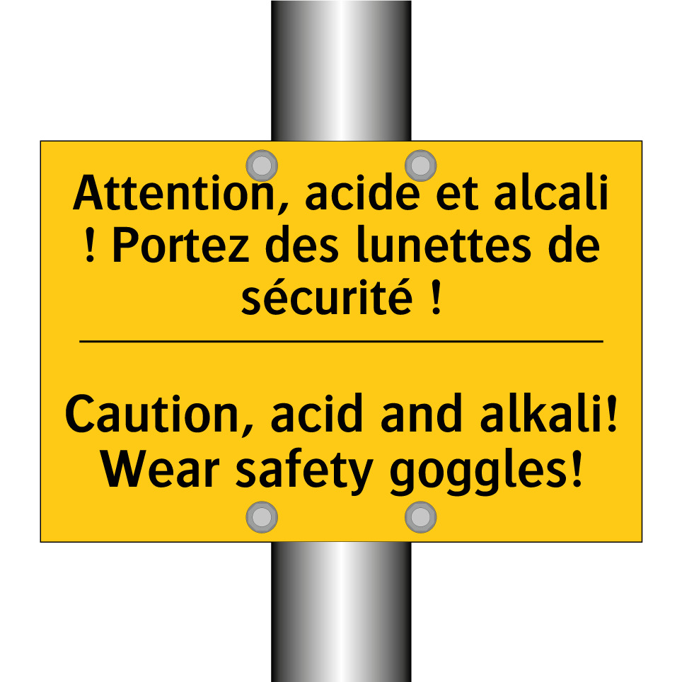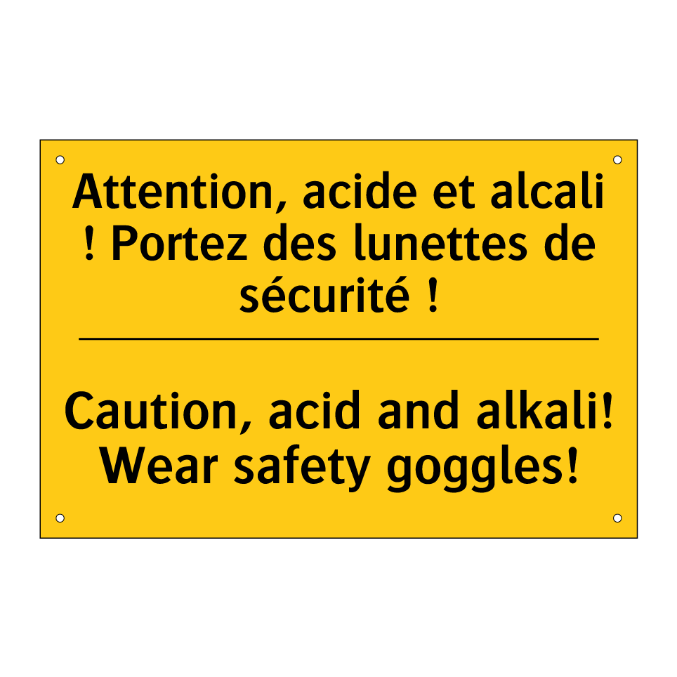 Panneau d'avertissement bilingue avec texte en français : "Attention, acide et alcali ! Portez des lunettes de sécurité !", et en anglais : "Caution, acid and alkali! Wear safety goggles!"