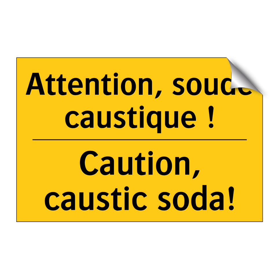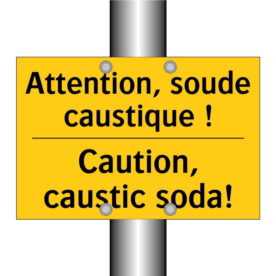 Panneau d'avertissement bilingue avec texte en français : "Attention, soude caustique !", et en anglais : "Caution, caustic soda!"