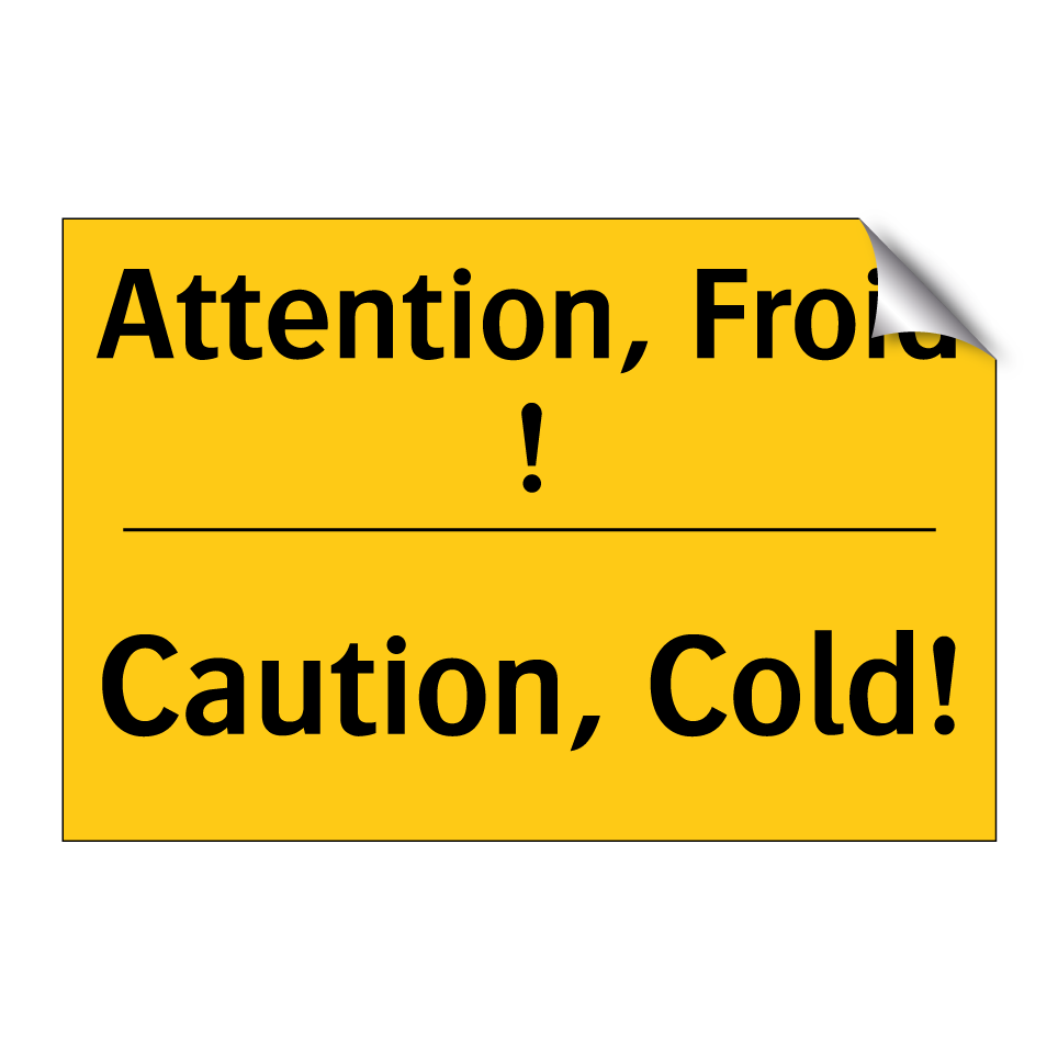 Panneau d'avertissement bilingue avec texte en français : "Attention, Froid !", et en anglais : "Caution, Cold!"
