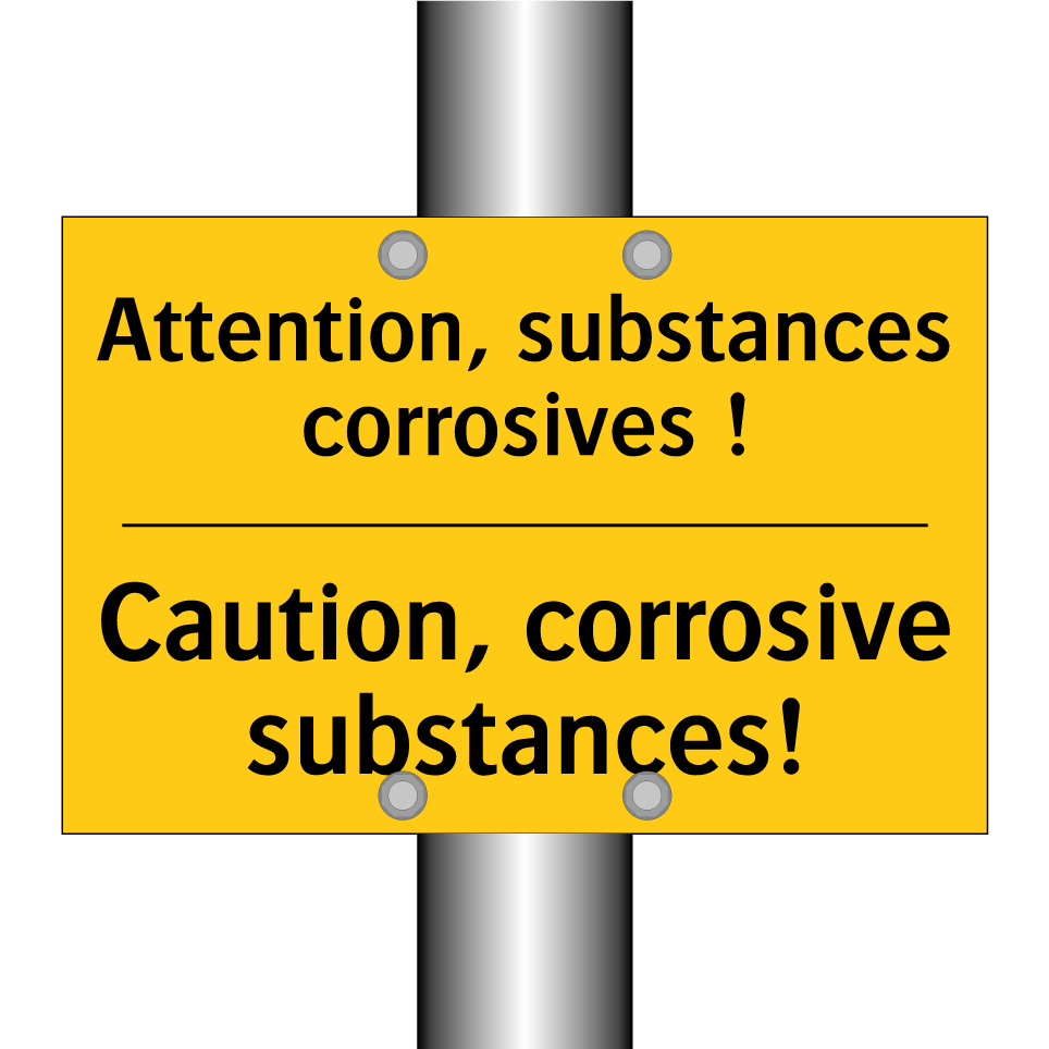 Panneau d'avertissement bilingue avec texte en français : "Attention, substances corrosives !", et en anglais : "Caution, corrosive substances!"