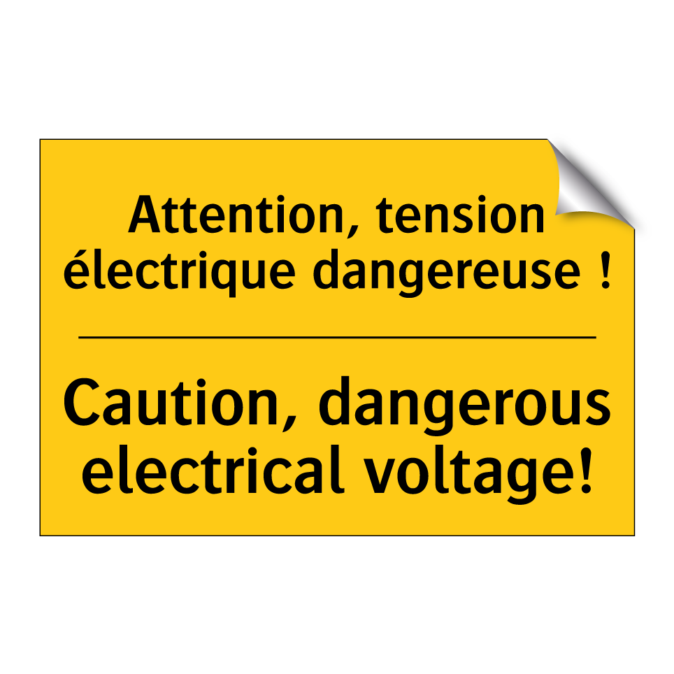 Panneau d'avertissement bilingue avec texte en français : "Attention, tension électrique dangereuse !", et en anglais : "Caution, dangerous electrical voltage!"