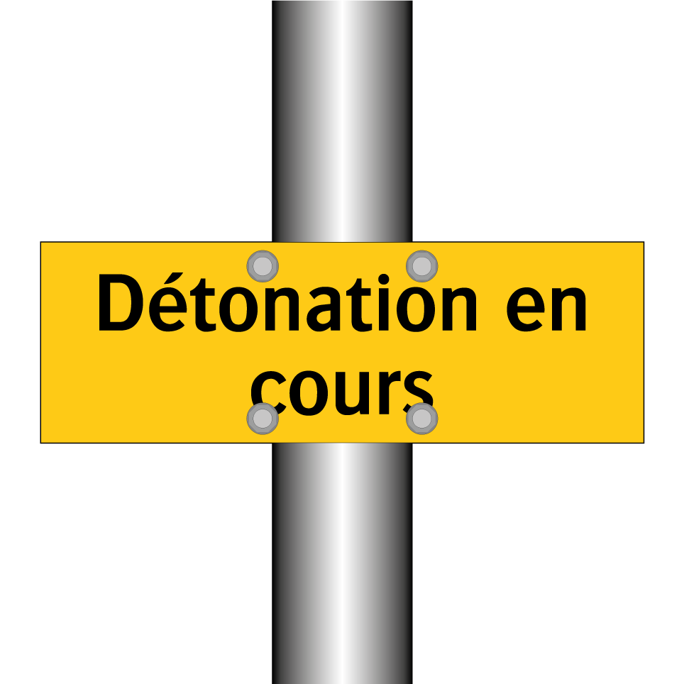Panneau d'avertissement avec le texte : "Détonation en cours"