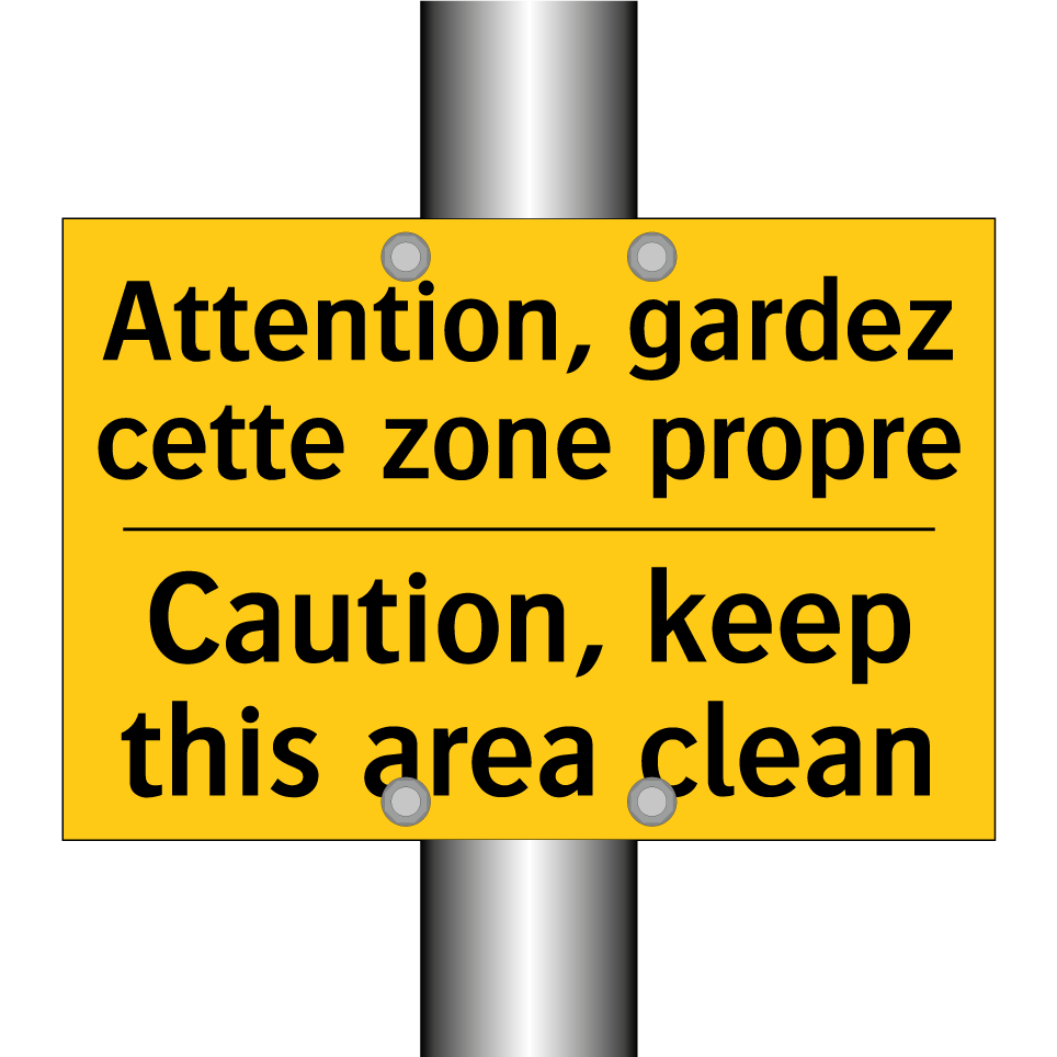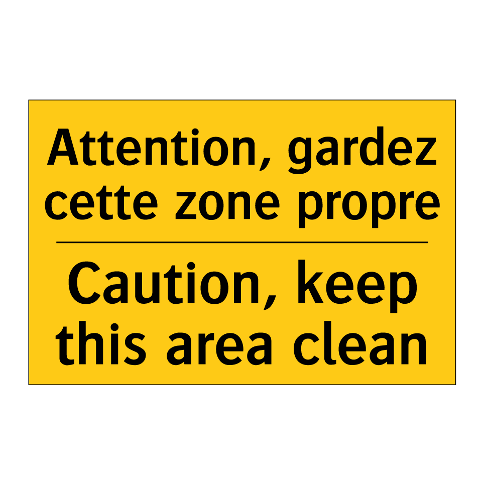Panneau d'avertissement bilingue avec texte en français : "Attention, gardez cette zone propre", et en anglais : "Caution, keep this area clean"
