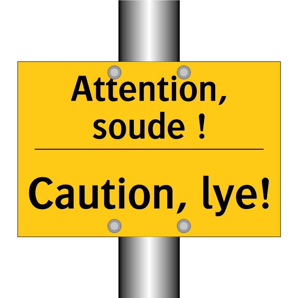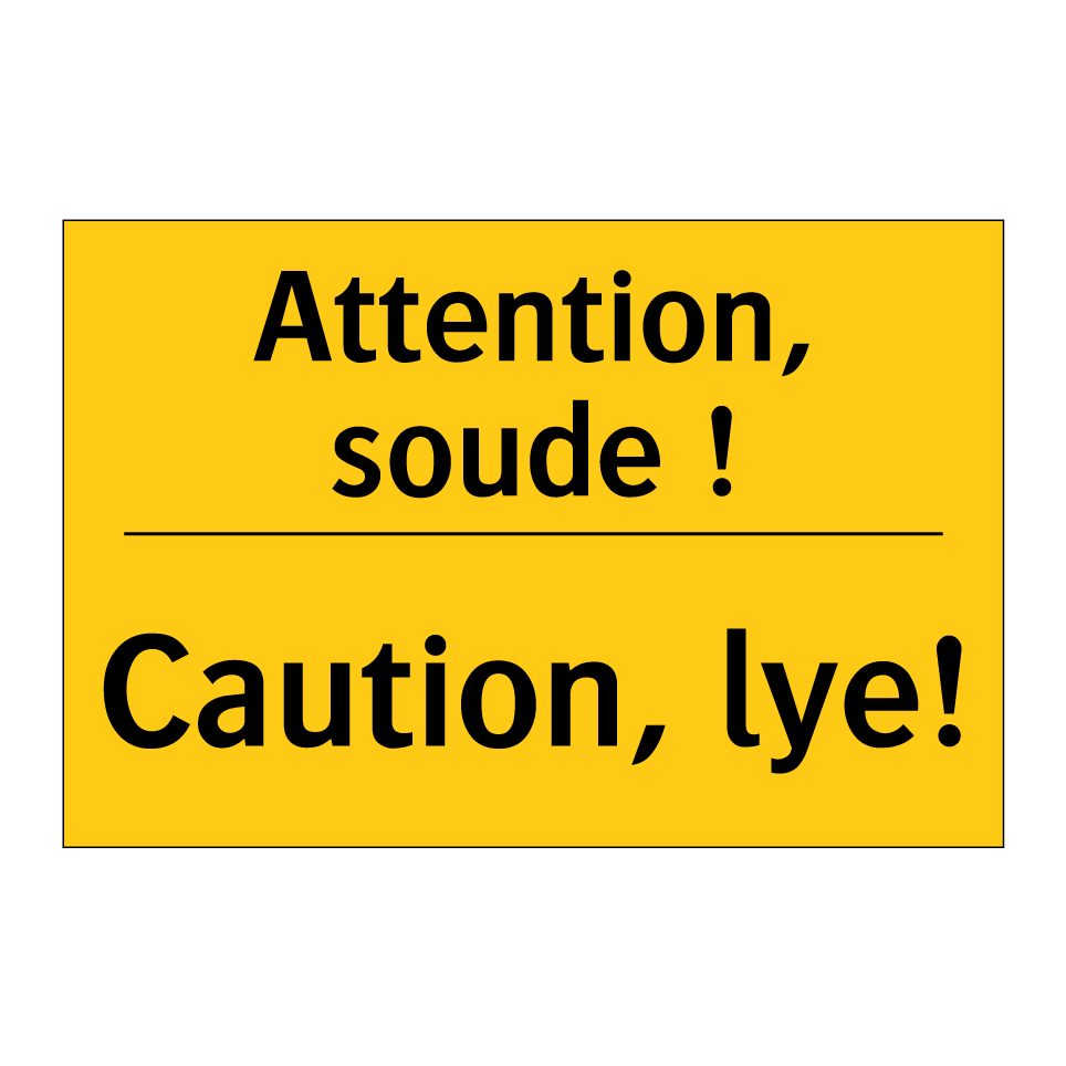 Panneau d'avertissement bilingue avec texte en français : "Attention, soude !", et en anglais : "Caution, lye!"