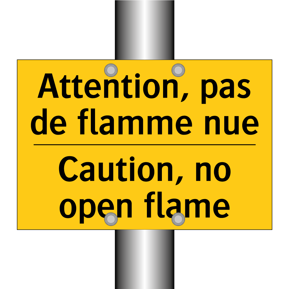 Panneau d'avertissement bilingue avec texte en français : "Attention, pas de flamme nue", et en anglais : "Caution, no open flame"