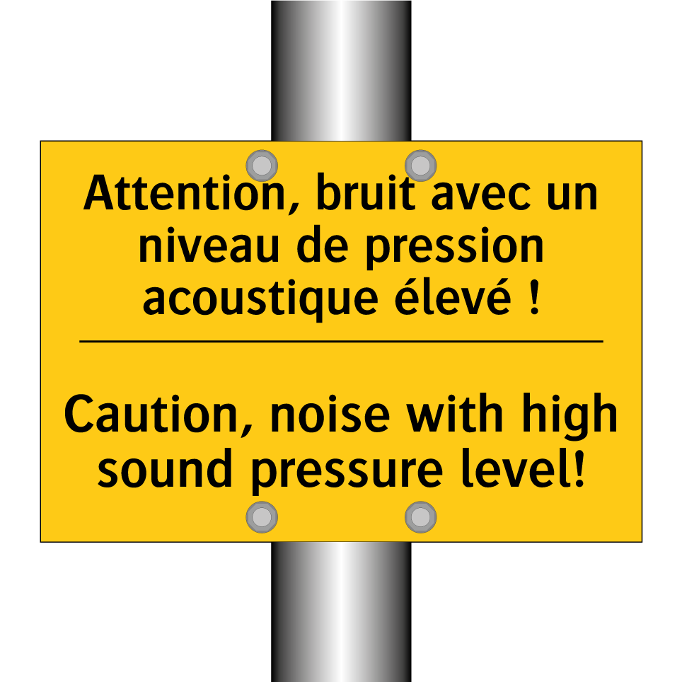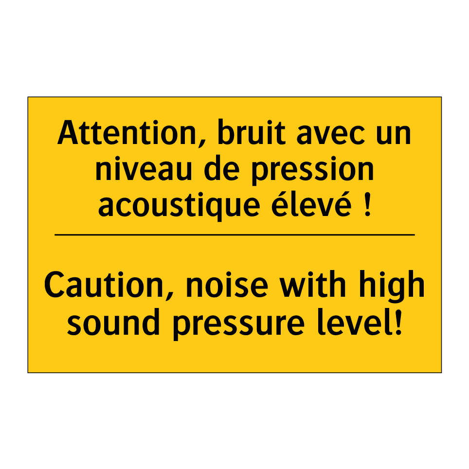 Panneau d'avertissement bilingue avec texte en français : "Attention, bruit avec un niveau de pression acoustique élevé !", et en anglais : "Caution, noise with high sound pressure level!"