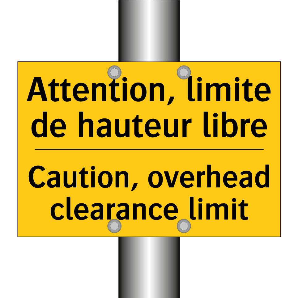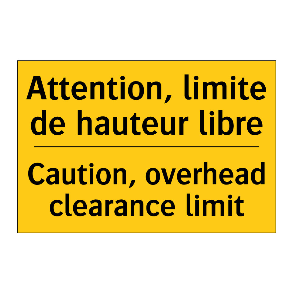 Panneau d'avertissement bilingue avec texte en français : "Attention, limite de hauteur libre", et en anglais : "Caution, overhead clearance limit"
