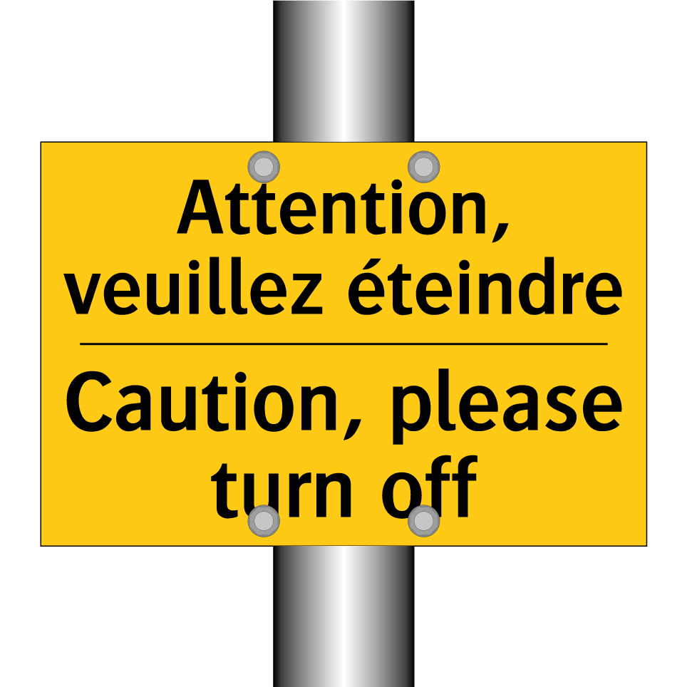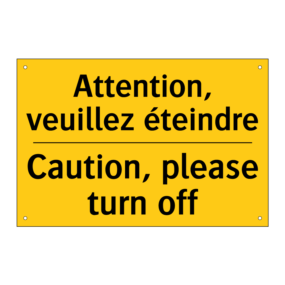 Panneau d'avertissement bilingue avec texte en français : "Attention, veuillez éteindre", et en anglais : "Caution, please turn off"