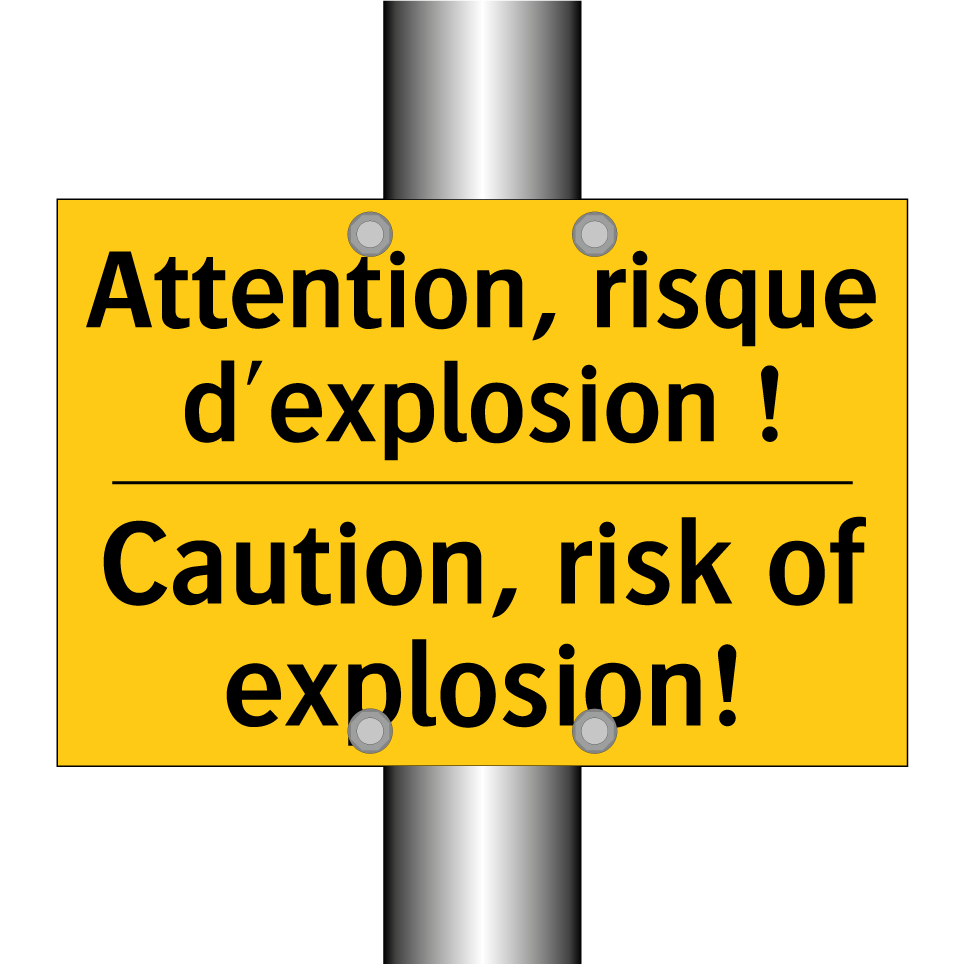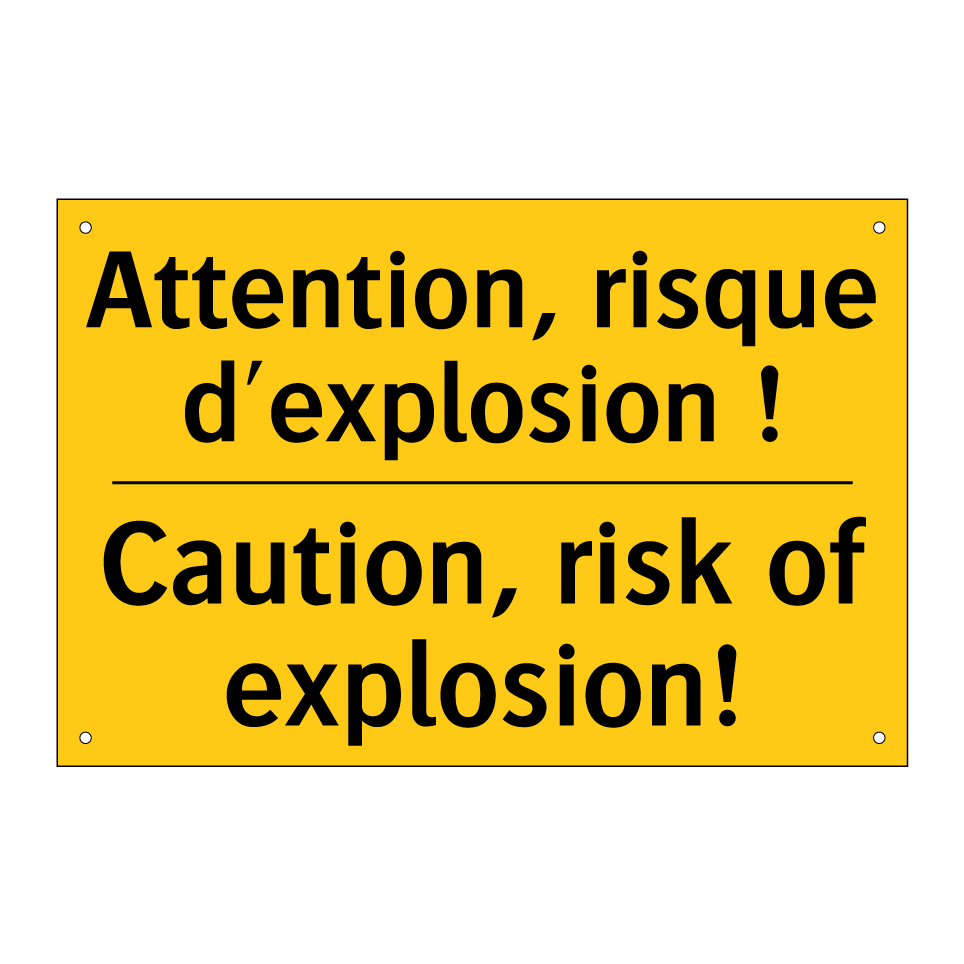 Panneau d'avertissement bilingue avec texte en français : "Attention, risque d'explosion !", et en anglais : "Caution, risk of explosion!"