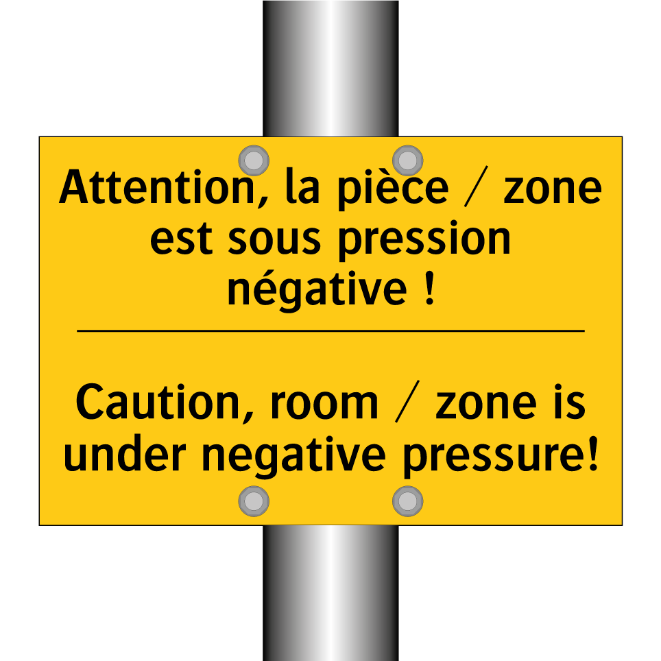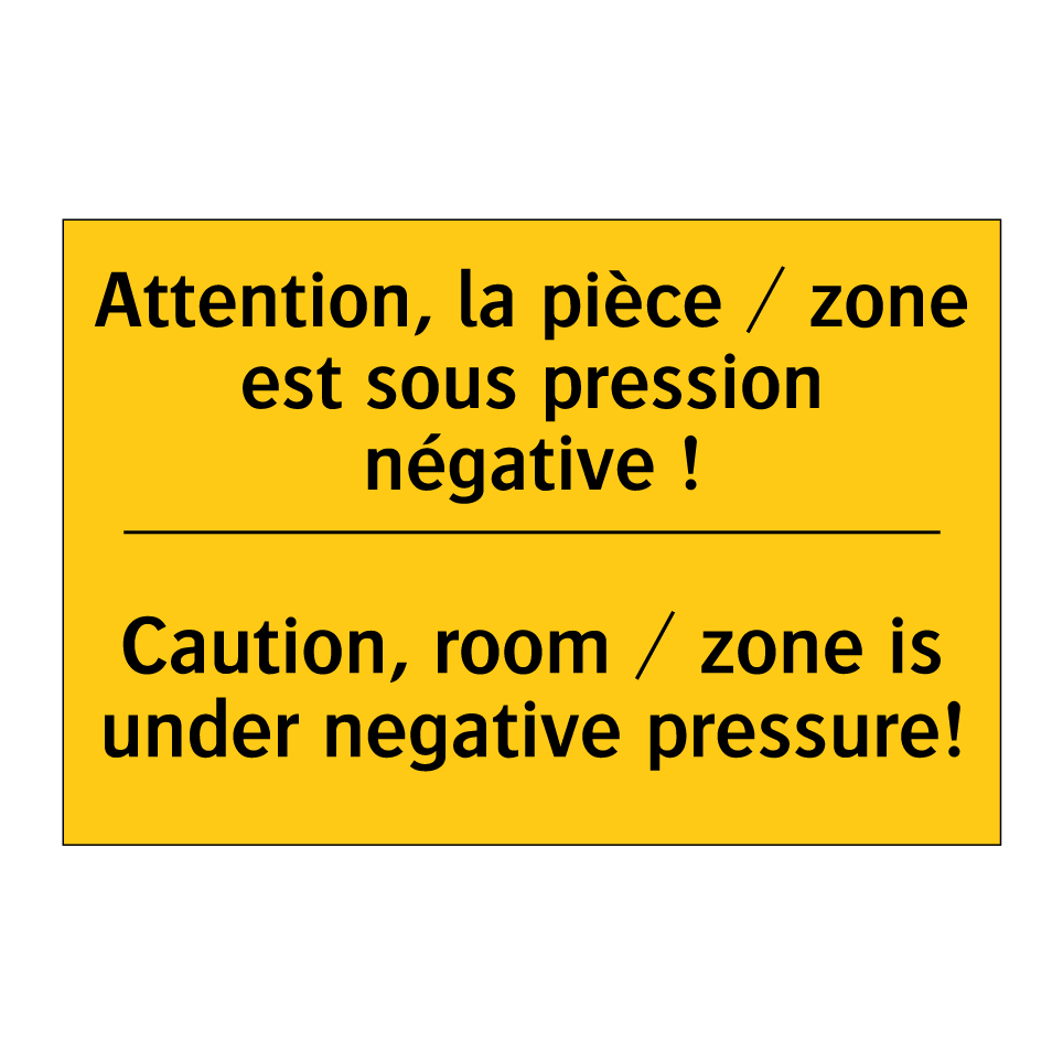 Panneau d'avertissement bilingue avec texte en français : "Attention, la pièce / zone est sous pression négative !", et en anglais : "Caution, room / zone is under negative pressure!"