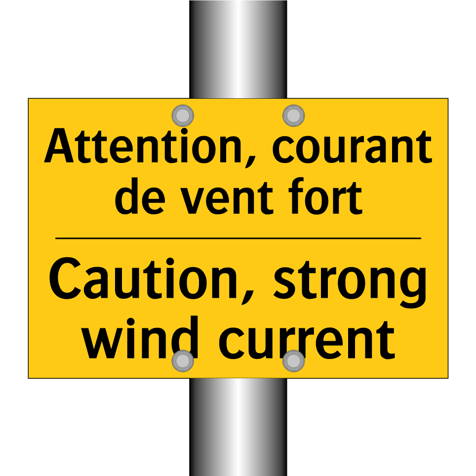 Panneau d'avertissement bilingue avec texte en français : "Attention, courant de vent fort", et en anglais : "Caution, strong wind current"
