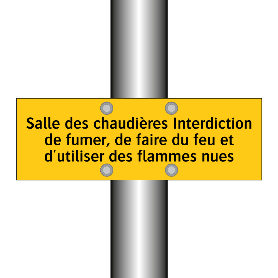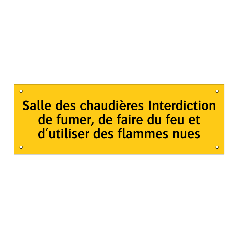Panneau d'avertissement avec le texte : "Salle des chaudières Interdiction de fumer, de faire du feu et d'utiliser des flammes nues"
