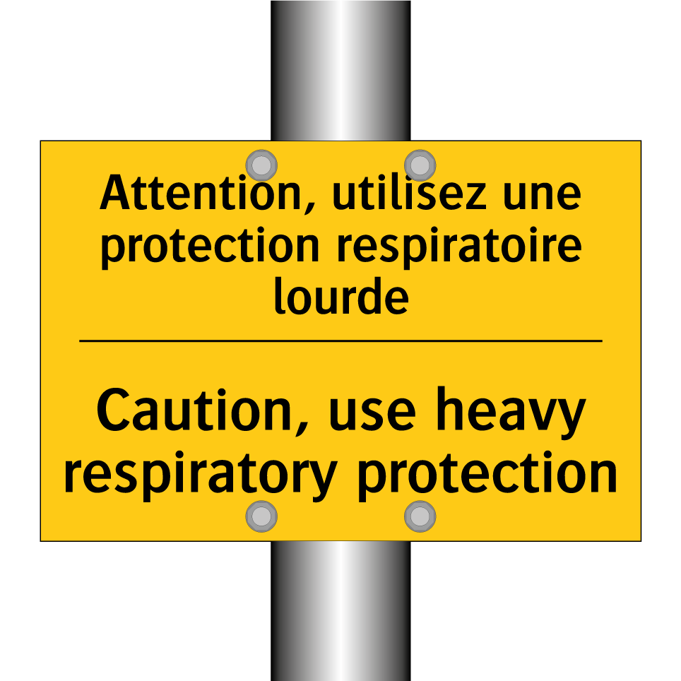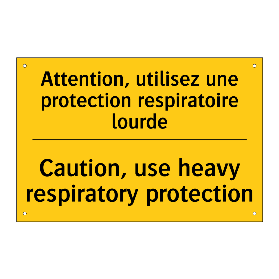 Panneau d'avertissement bilingue avec texte en français : "Attention, utilisez une protection respiratoire lourde", et en anglais : "Caution, use heavy respiratory protection"