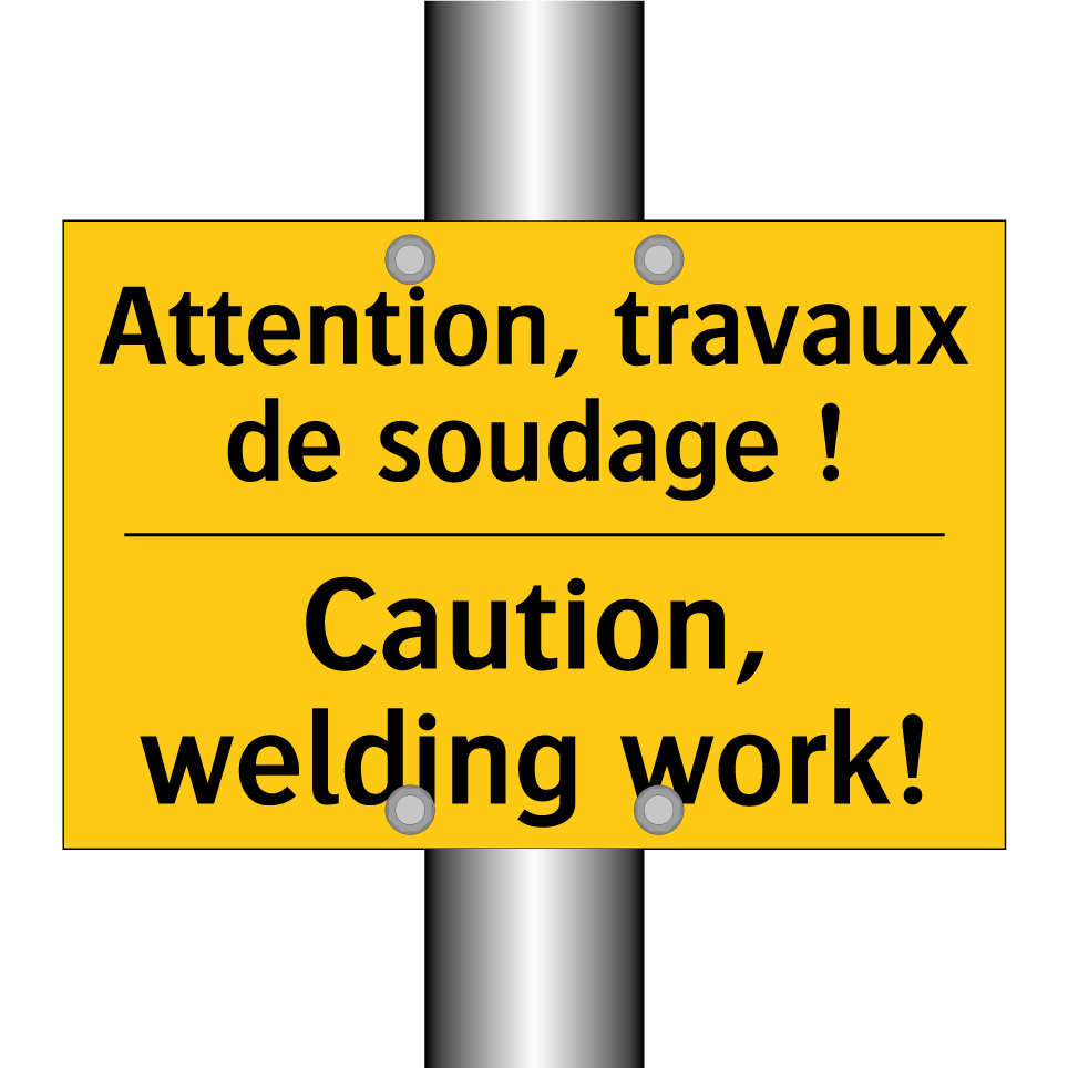 Panneau d'avertissement bilingue avec texte en français : "Attention, travaux de soudage !", et en anglais : "Caution, welding work!"