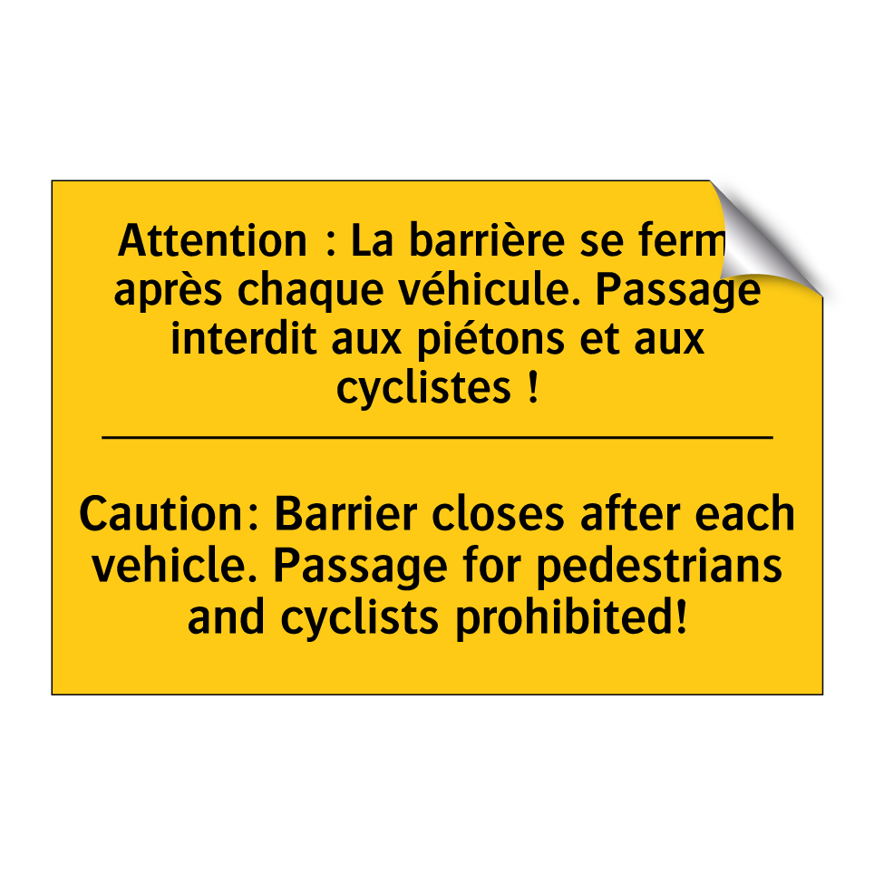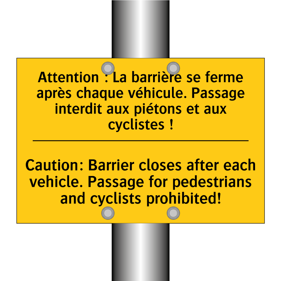 Panneau d'avertissement bilingue avec texte en français : "Attention : La barrière se ferme après chaque véhicule. Passage interdit aux piétons et aux cyclistes !", et en anglais : "Caution: Barrier closes after each vehicle. Passage for pedestrians and cyclists prohibited!"