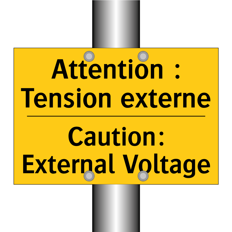 Panneau d'avertissement bilingue avec texte en français : "Attention : Tension externe", et en anglais : "Caution: External Voltage"