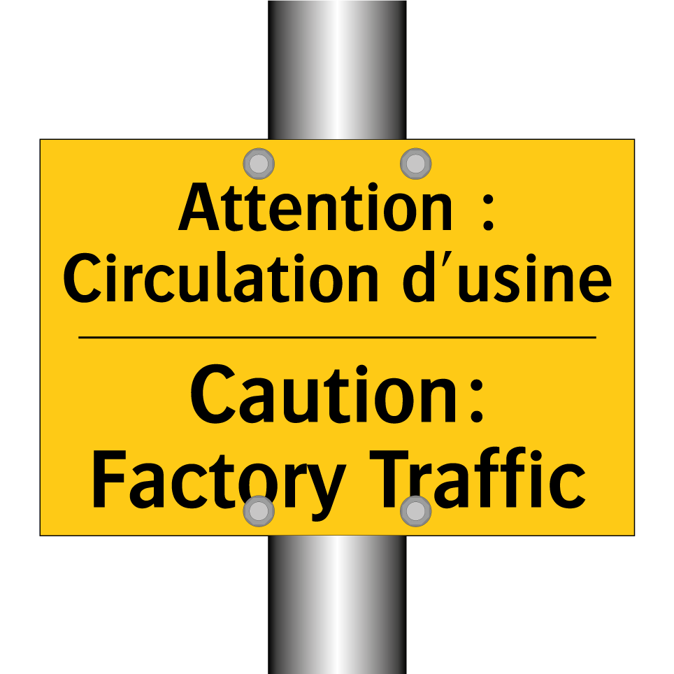 Panneau d'avertissement bilingue avec texte en français : "Attention : Circulation d'usine", et en anglais : "Caution: Factory Traffic"