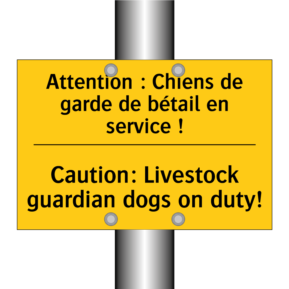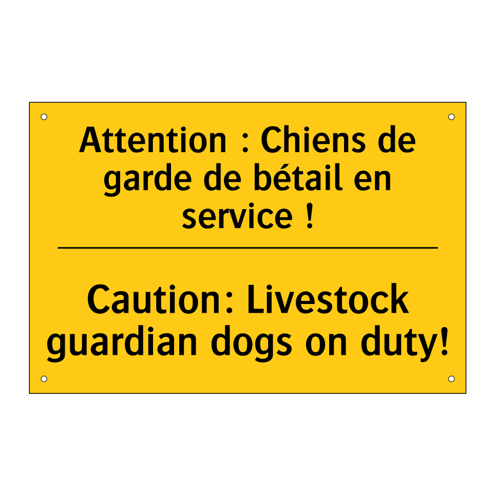 Panneau d'avertissement bilingue avec texte en français : "Attention : Chiens de garde de bétail en service !", et en anglais : "Caution: Livestock guardian dogs on duty!"