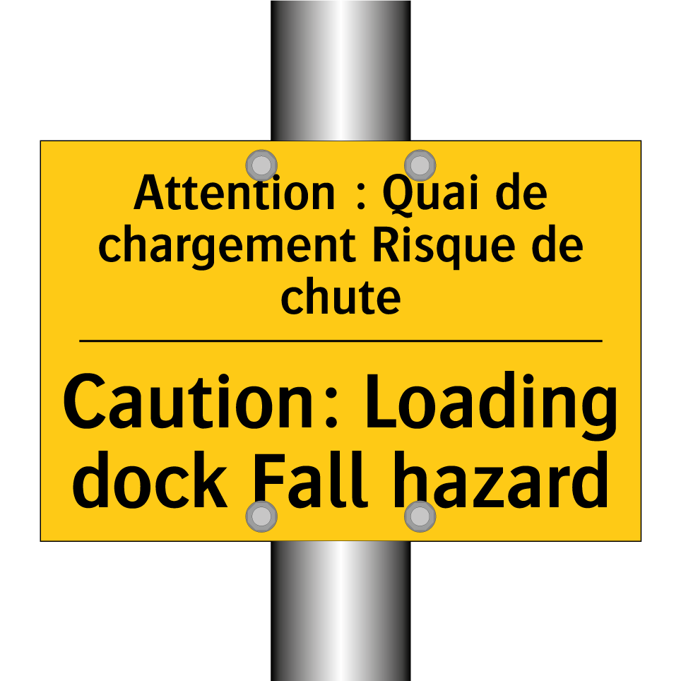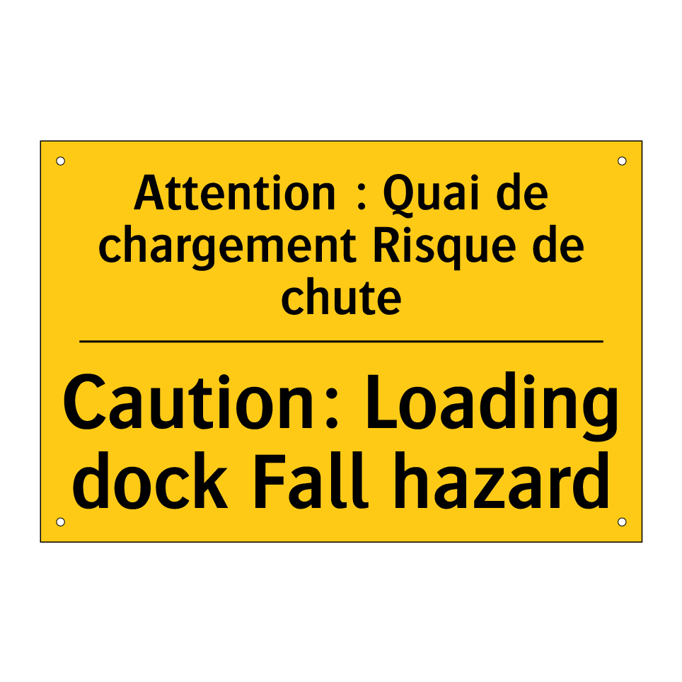 Panneau d'avertissement bilingue avec texte en français : "Attention : Quai de chargement Risque de chute", et en anglais : "Caution: Loading dock Fall hazard"