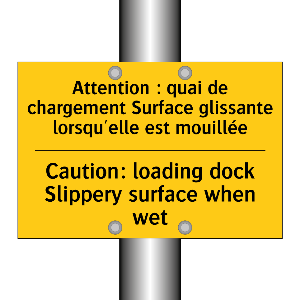 Panneau d'avertissement bilingue avec texte en français : "Attention : quai de chargement Surface glissante lorsqu'elle est mouillée", et en anglais : "Caution: loading dock Slippery surface when wet"