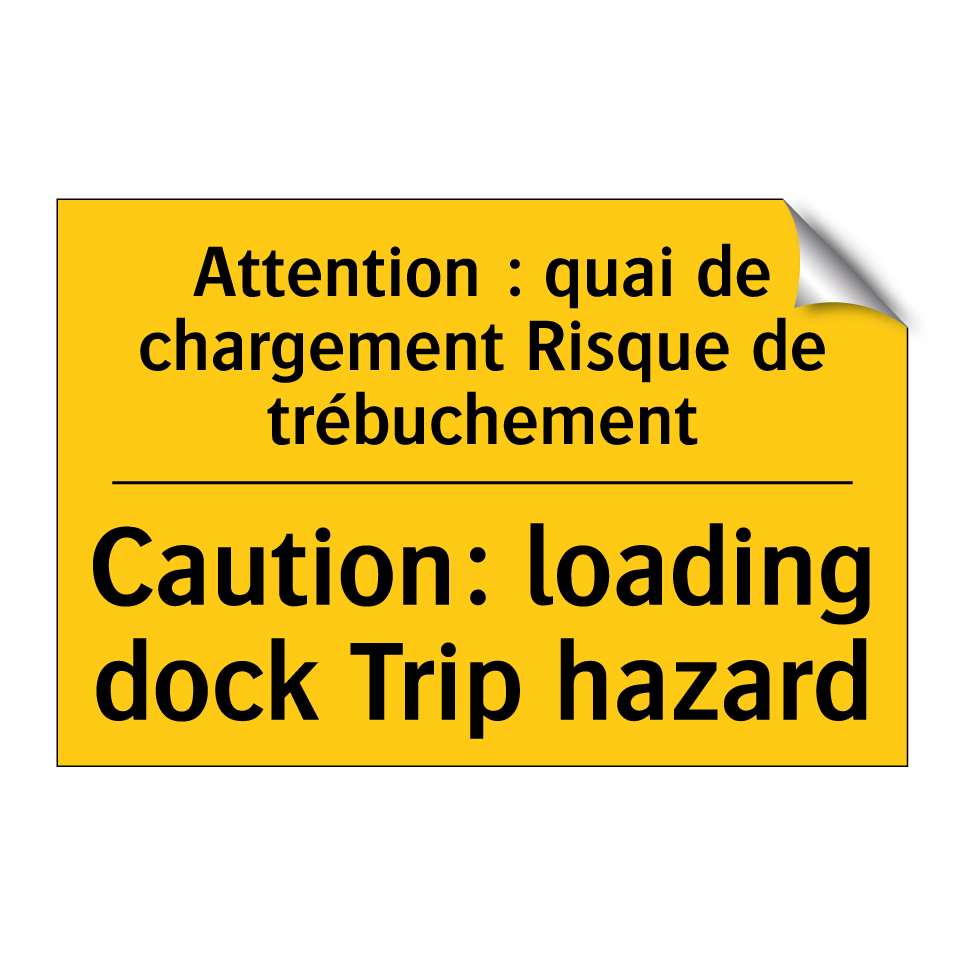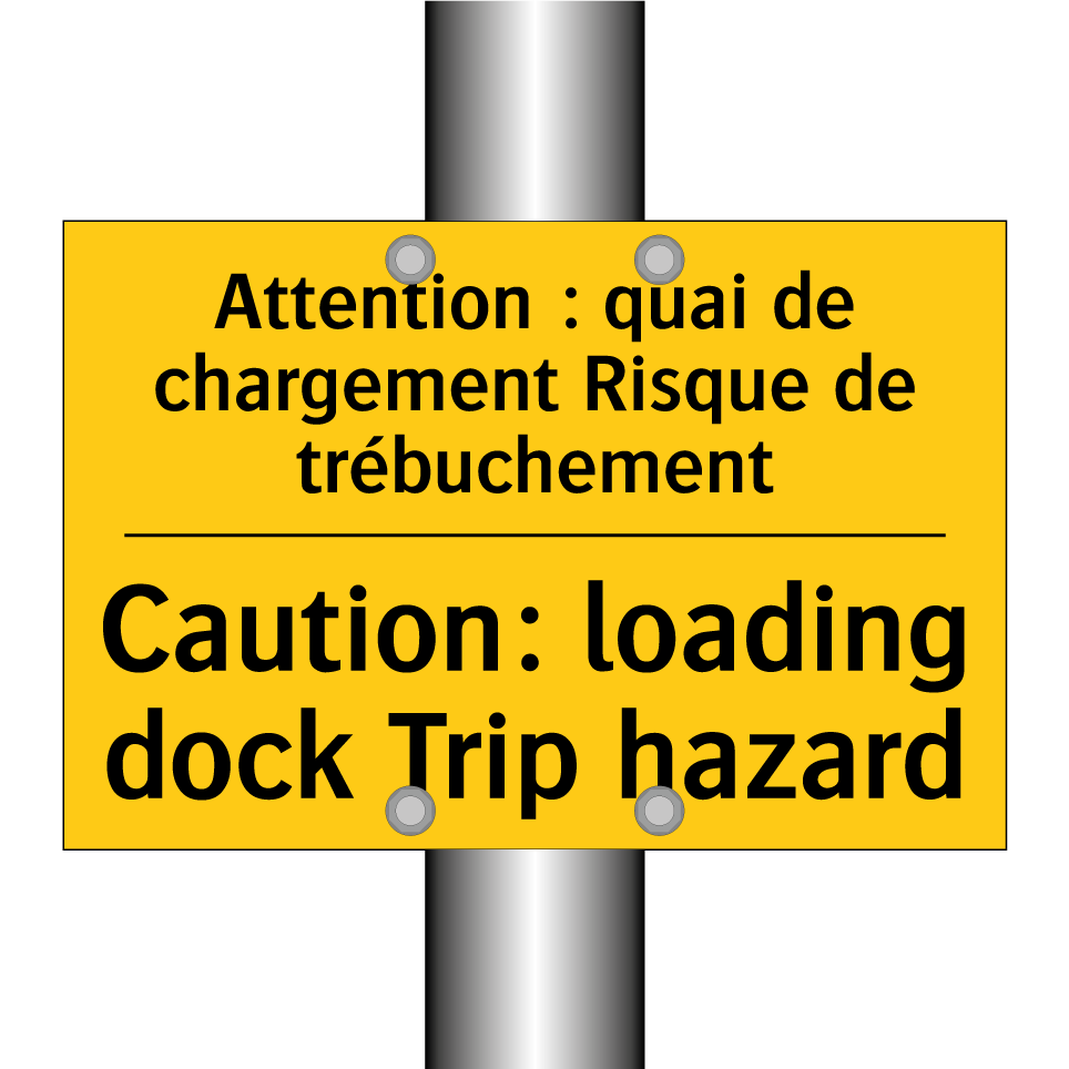Panneau d'avertissement bilingue avec texte en français : "Attention : quai de chargement Risque de trébuchement", et en anglais : "Caution: loading dock Trip hazard"