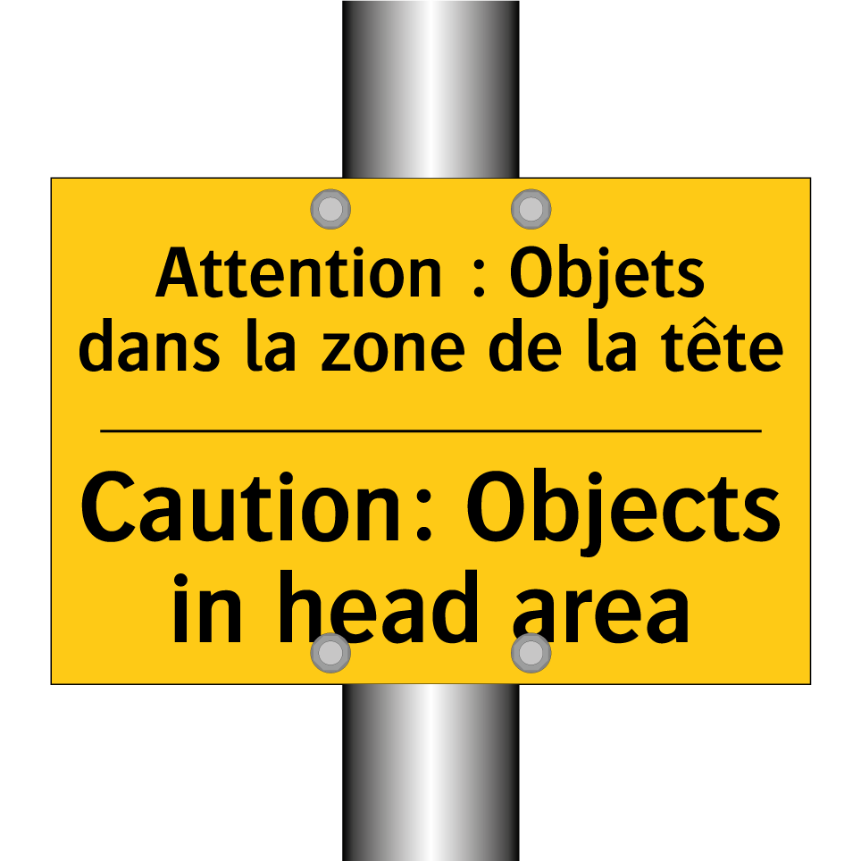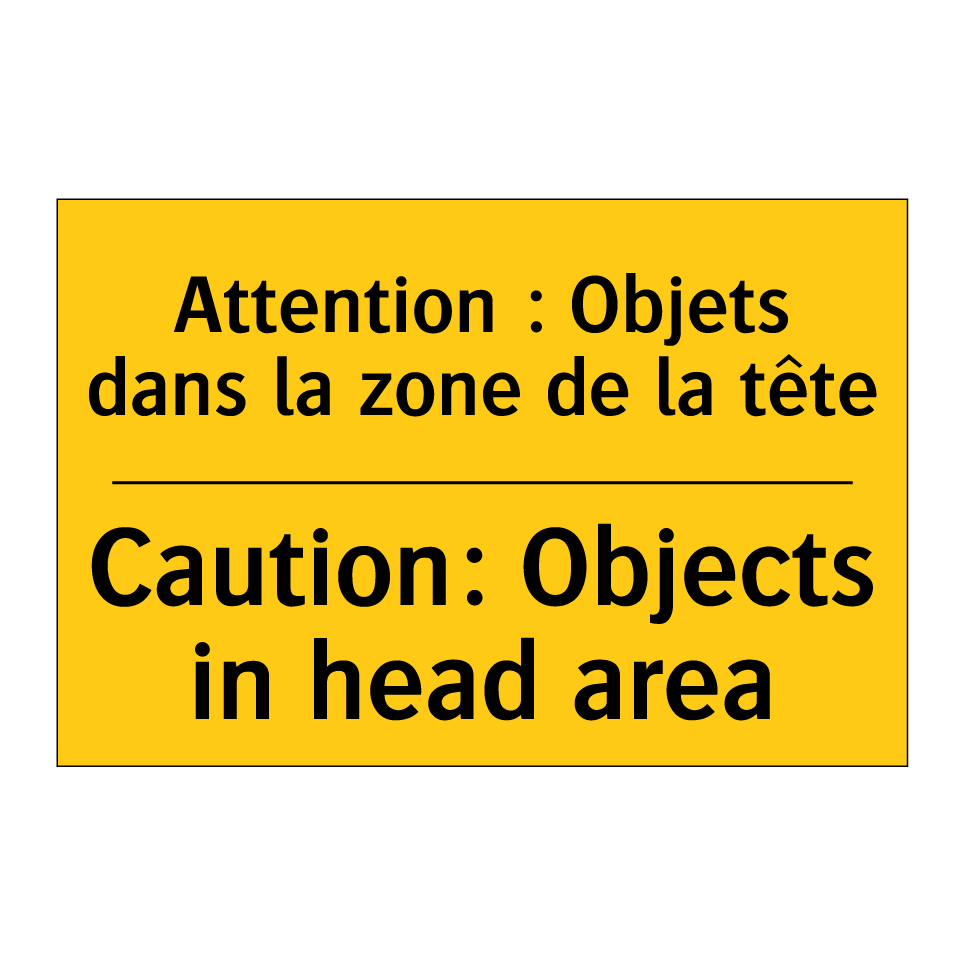 Panneau d'avertissement bilingue avec texte en français : "Attention : Objets dans la zone de la tête", et en anglais : "Caution: Objects in head area"