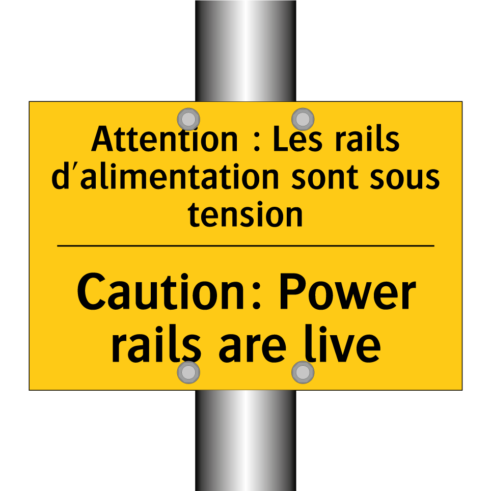 Panneau d'avertissement bilingue avec texte en français : "Attention : Les rails d'alimentation sont sous tension", et en anglais : "Caution: Power rails are live"