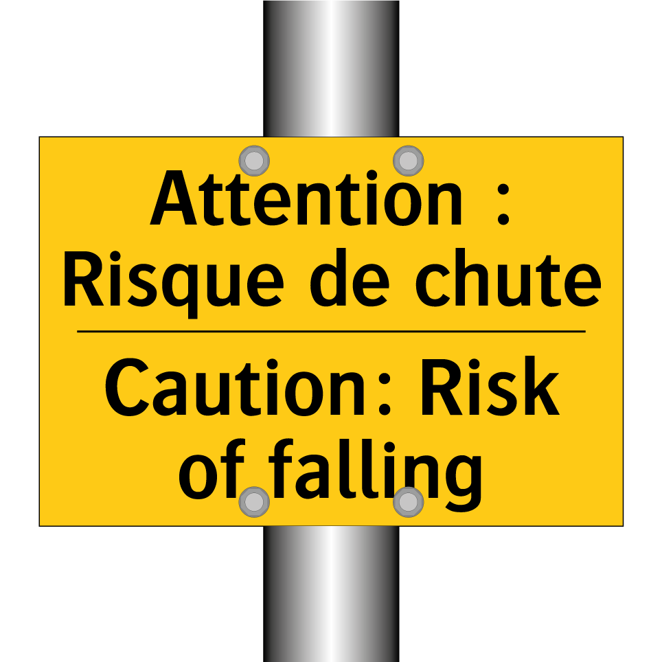 Panneau d'avertissement bilingue avec texte en français : "Attention : Risque de chute", et en anglais : "Caution: Risk of falling"