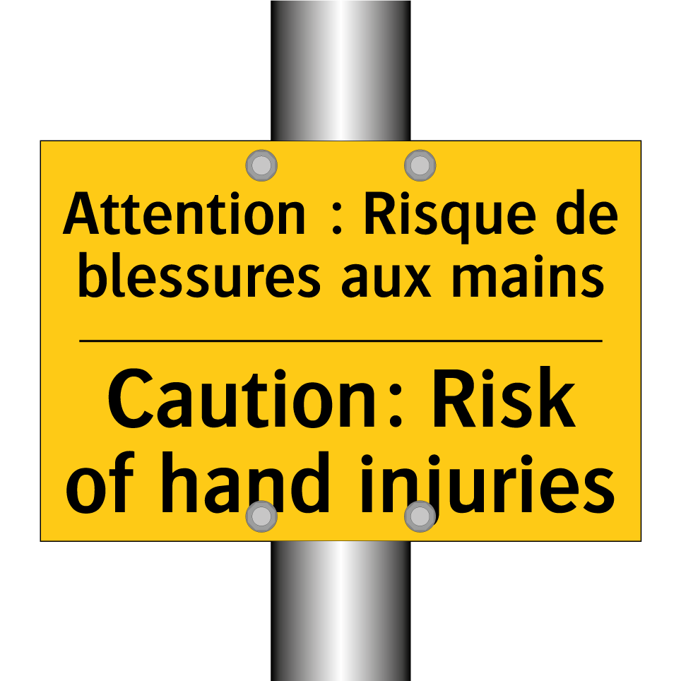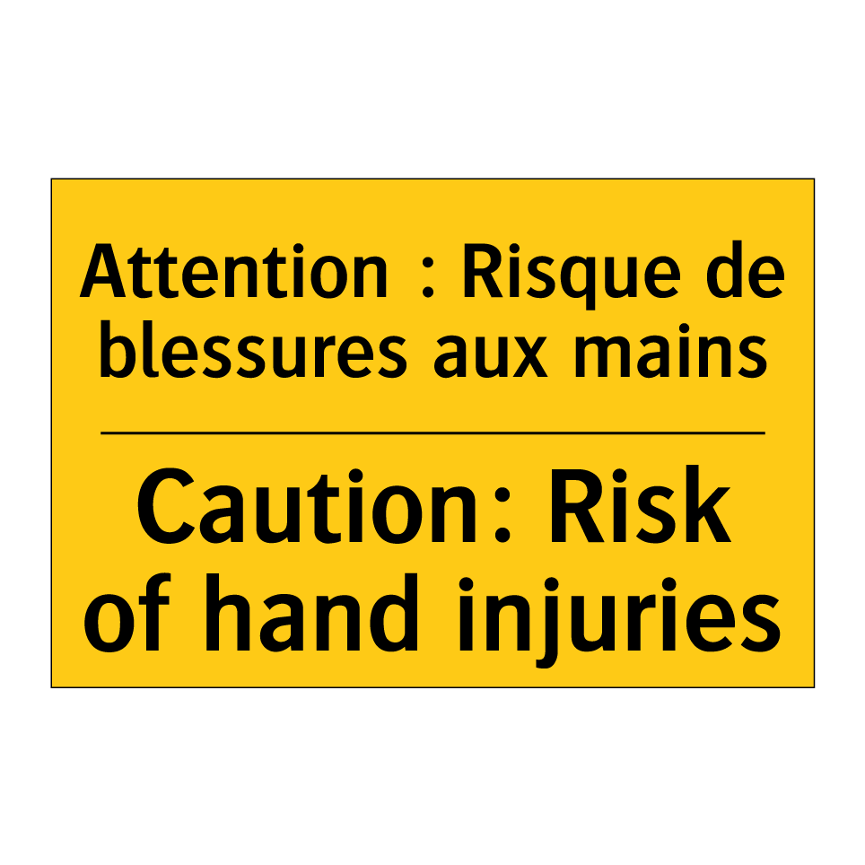 Panneau d'avertissement bilingue avec texte en français : "Attention : Risque de blessures aux mains", et en anglais : "Caution: Risk of hand injuries"