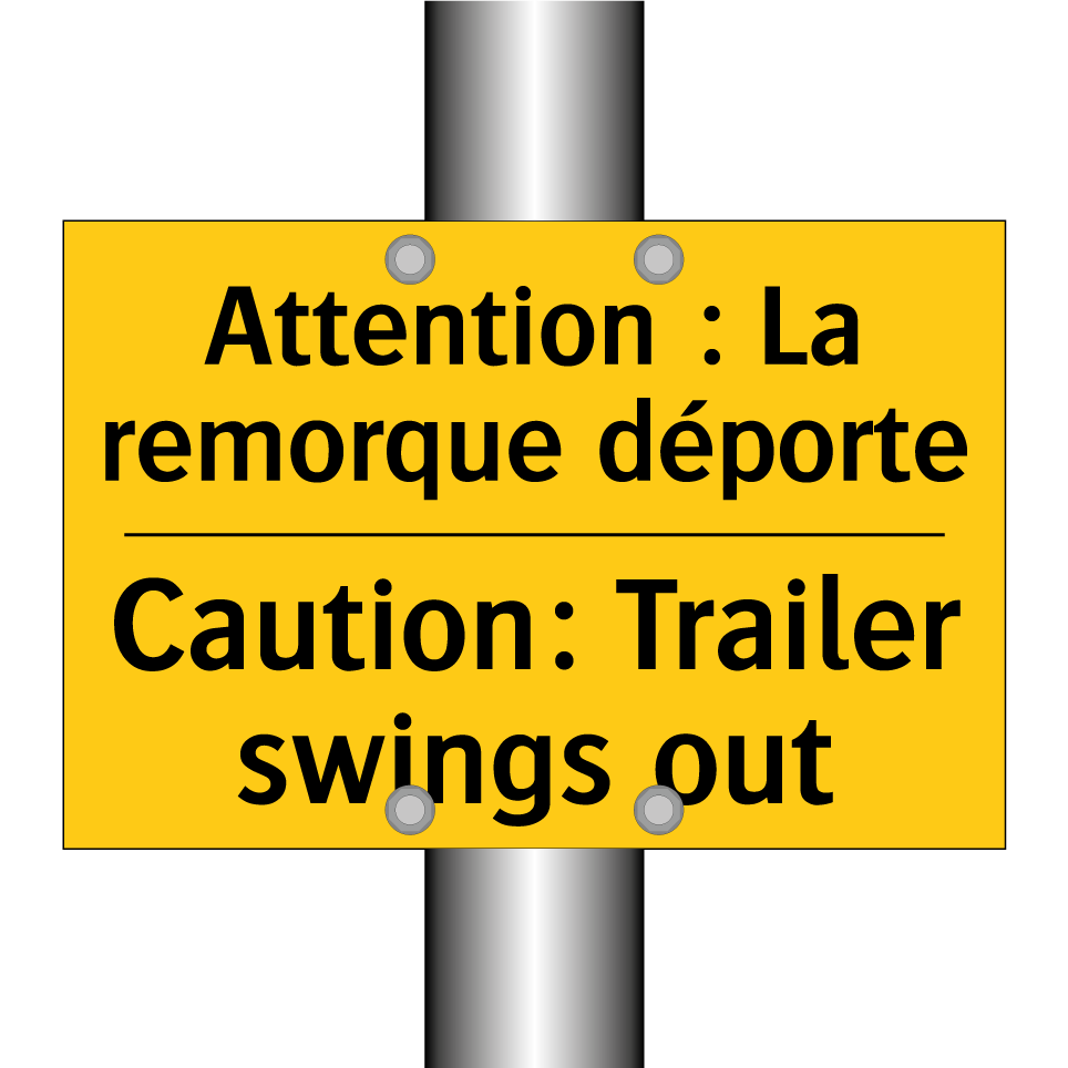 Panneau d'avertissement bilingue avec texte en français : "Attention : La remorque déporte", et en anglais : "Caution: Trailer swings out"