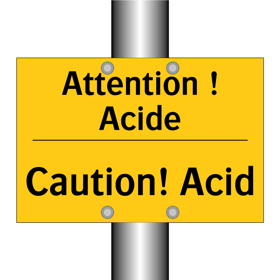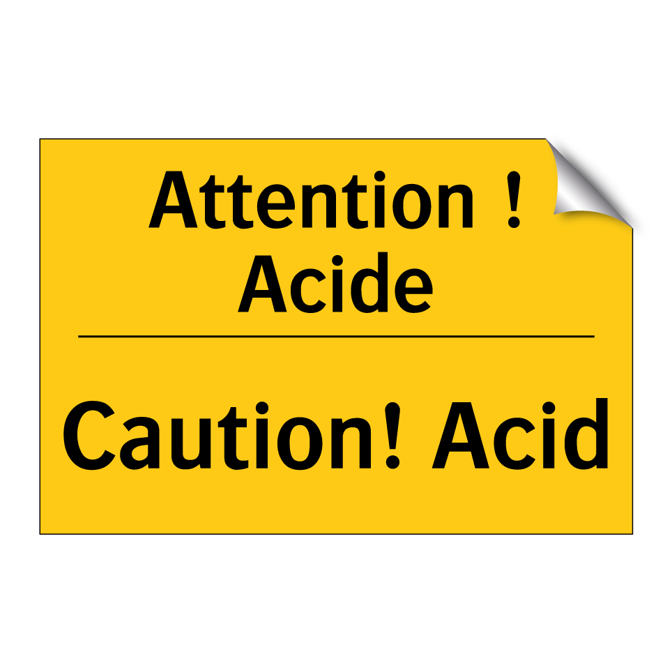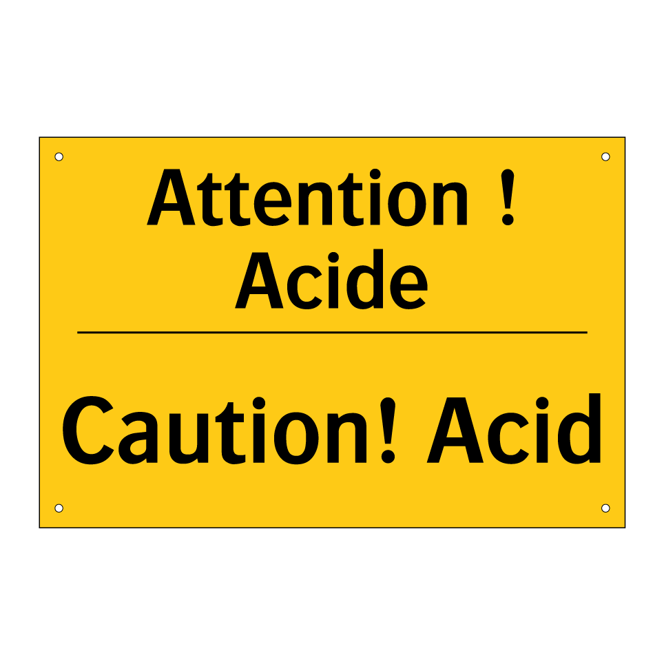 Panneau d'avertissement bilingue avec texte en français : "Attention ! Acide", et en anglais : "Caution! Acid"