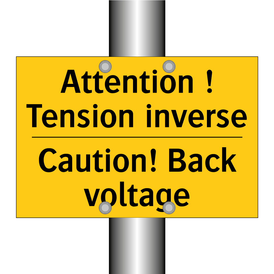 Panneau d'avertissement bilingue avec texte en français : "Attention ! Tension inverse", et en anglais : "Caution! Back voltage"
