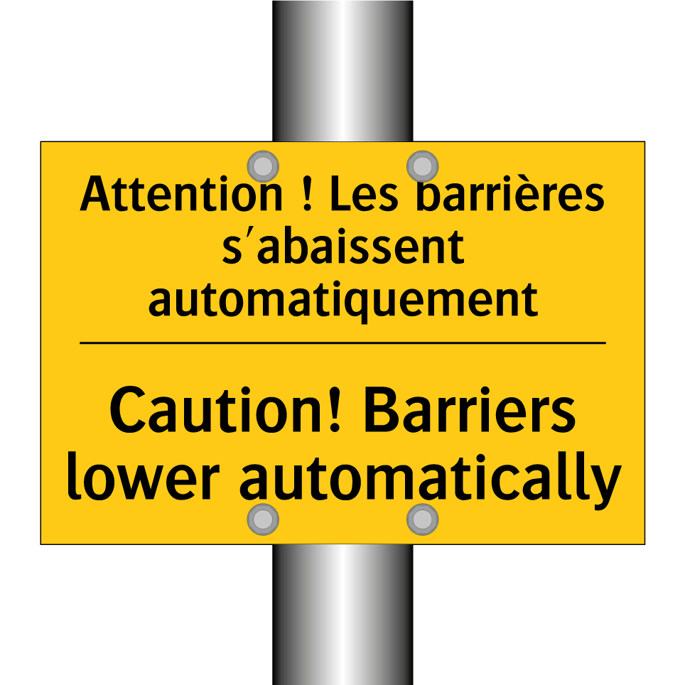 Panneau d'avertissement bilingue avec texte en français : "Attention ! Les barrières s'abaissent automatiquement", et en anglais : "Caution! Barriers lower automatically"