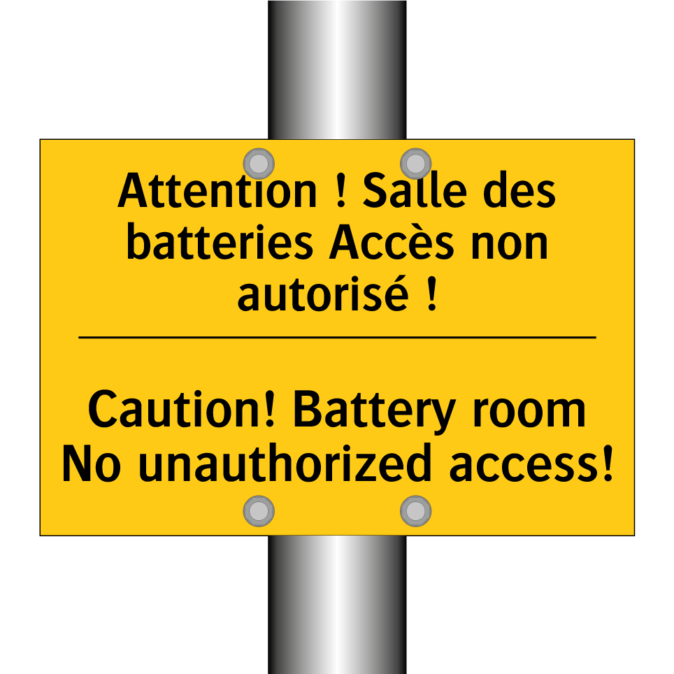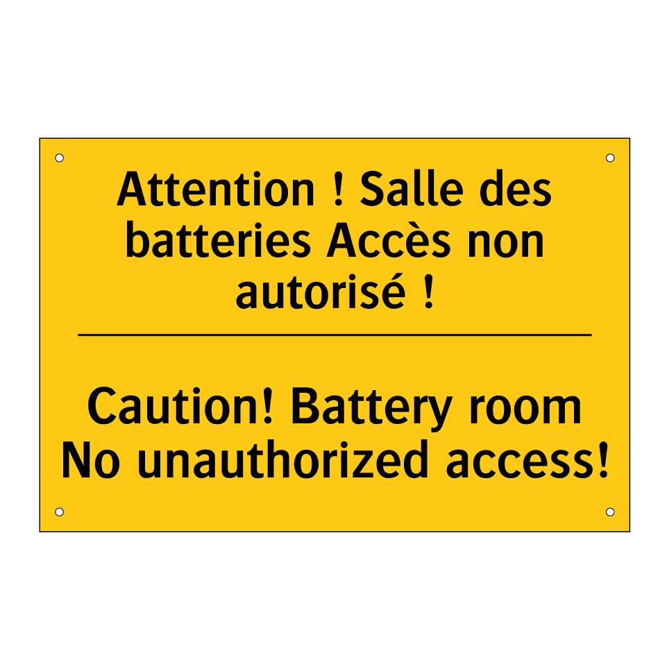 Panneau d'avertissement bilingue avec texte en français : "Attention ! Salle des batteries Accès non autorisé !", et en anglais : "Caution! Battery room No unauthorized access!"