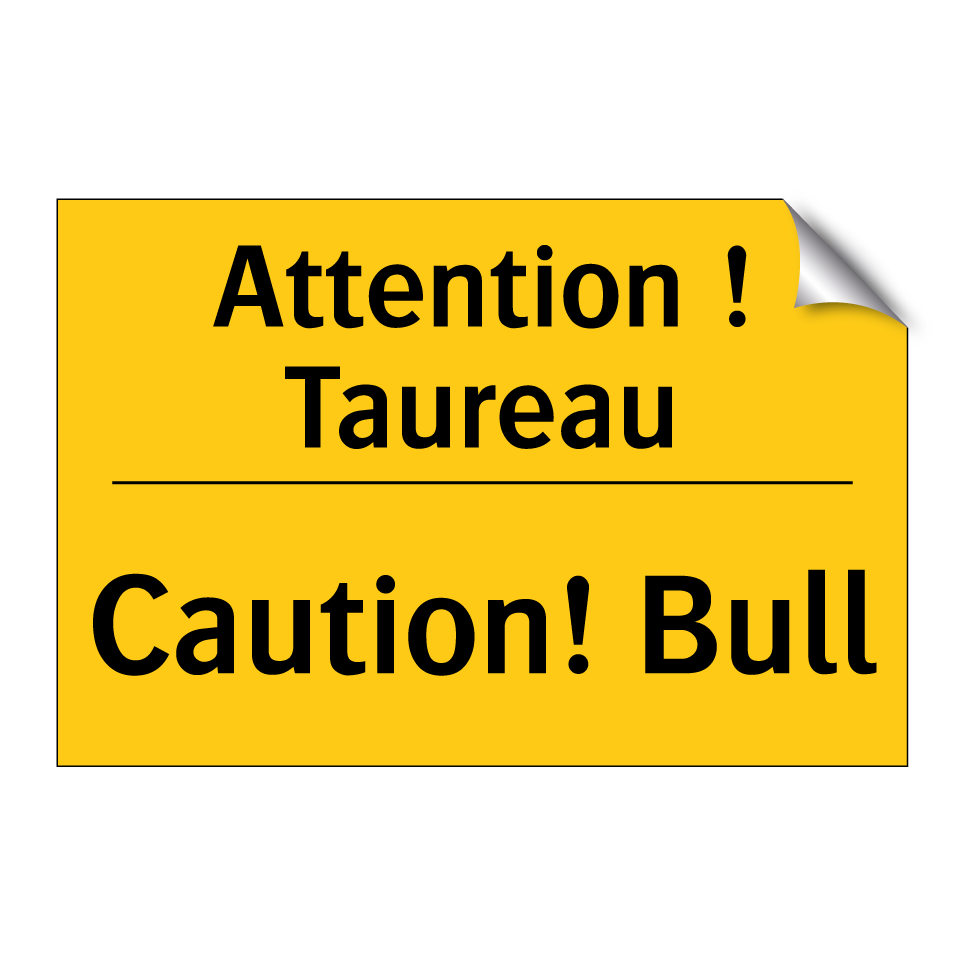 Panneau d'avertissement bilingue avec texte en français : "Attention ! Taureau", et en anglais : "Caution! Bull"