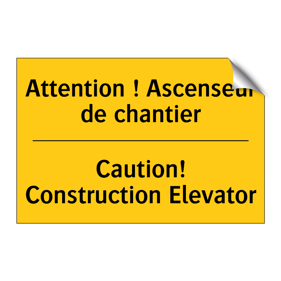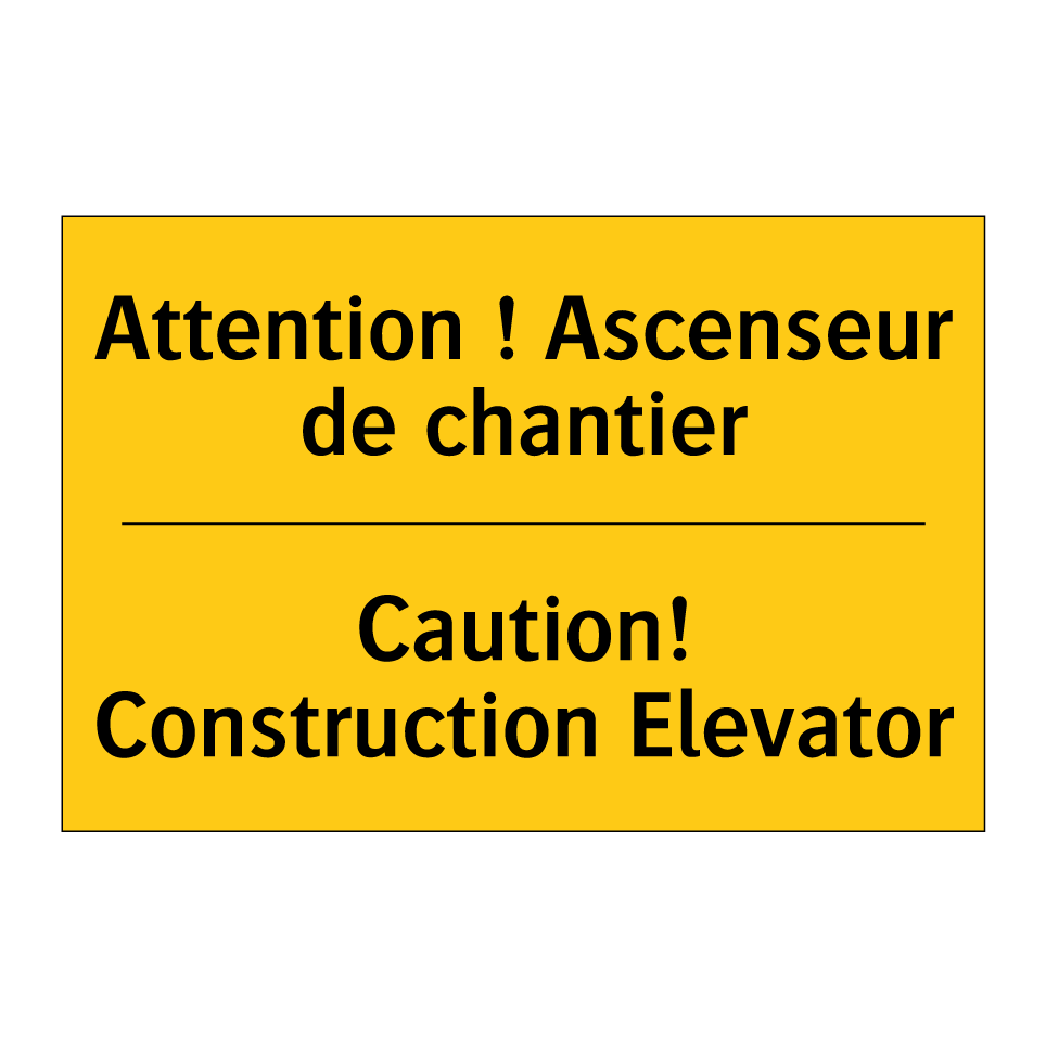 Panneau d'avertissement bilingue avec texte en français : "Attention ! Ascenseur de chantier", et en anglais : "Caution! Construction Elevator"