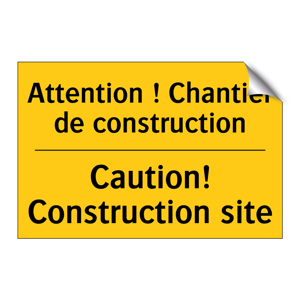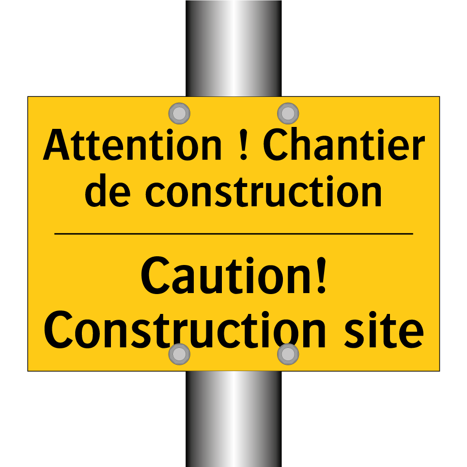 Panneau d'avertissement bilingue avec texte en français : "Attention ! Chantier de construction", et en anglais : "Caution! Construction site"