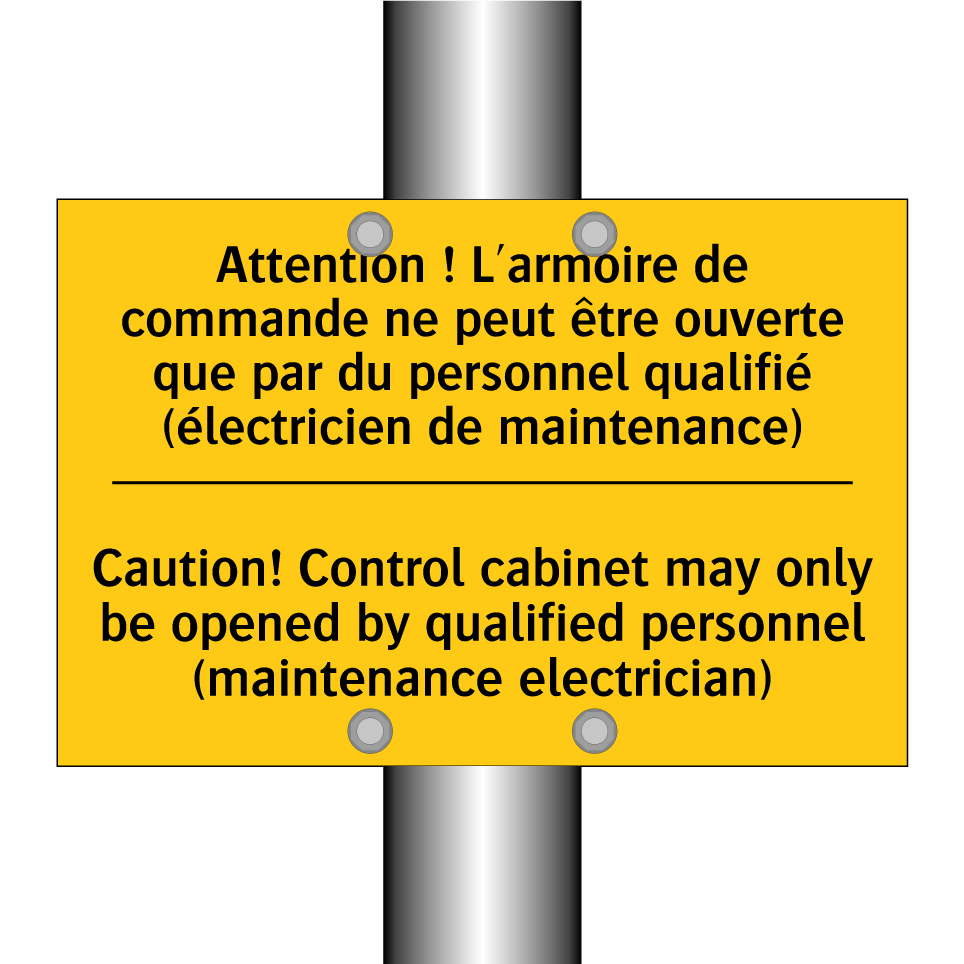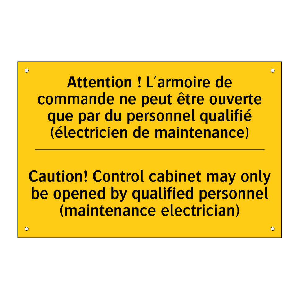 Panneau d'avertissement bilingue avec texte en français : "Attention ! L'armoire de commande ne peut être ouverte que par du personnel qualifié (électricien de maintenance)", et en anglais : "Caution! Control cabinet may only be opened by qualified personnel (maintenance electrician)"