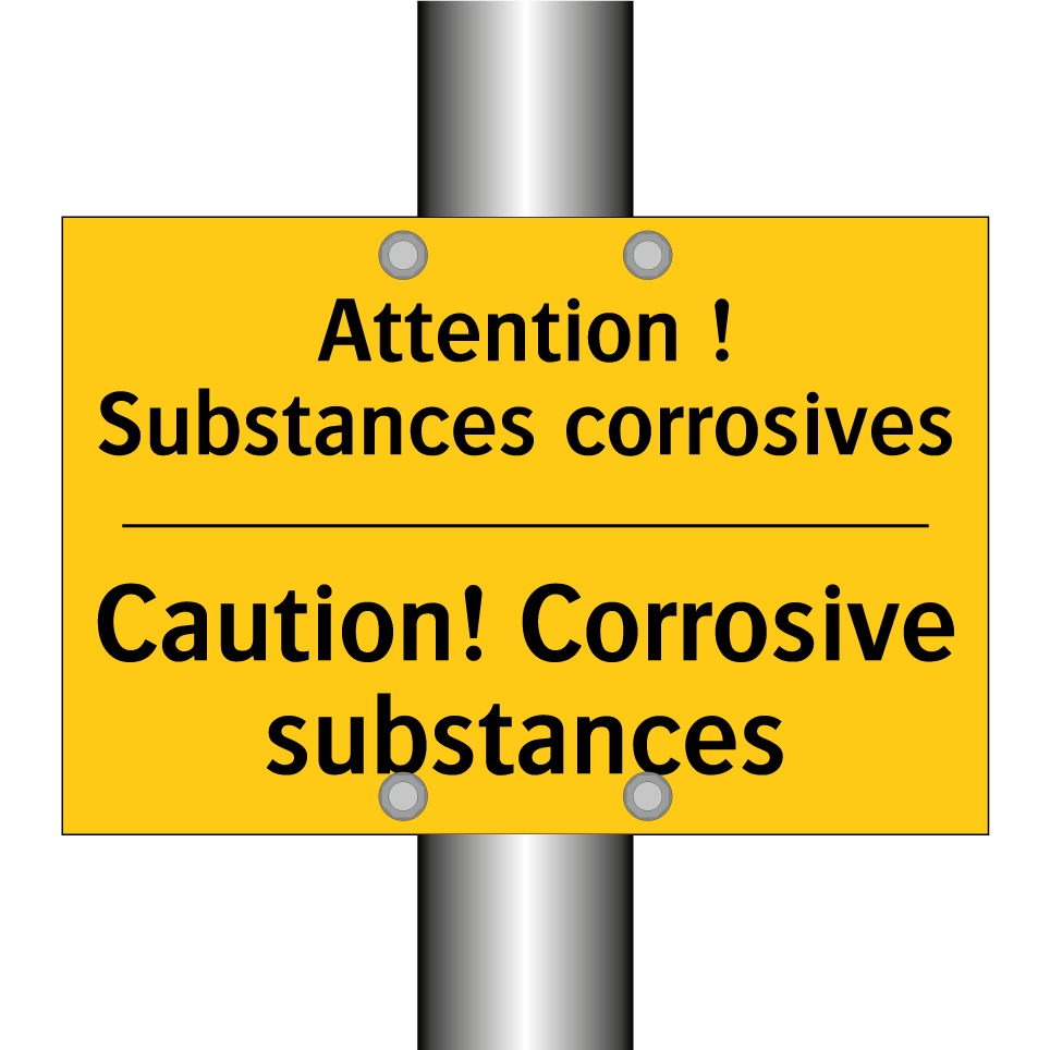 Panneau d'avertissement bilingue avec texte en français : "Attention ! Substances corrosives", et en anglais : "Caution! Corrosive substances"