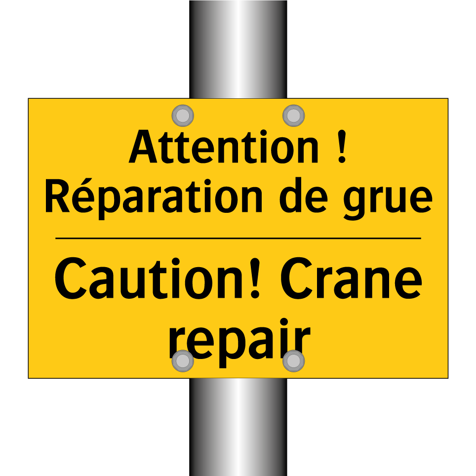 Panneau d'avertissement bilingue avec texte en français : "Attention ! Réparation de grue", et en anglais : "Caution! Crane repair"