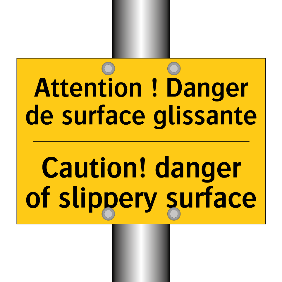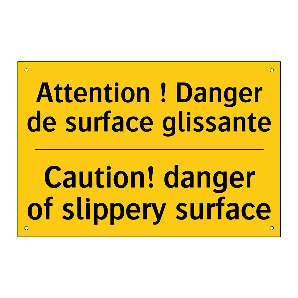 Panneau d'avertissement bilingue avec texte en français : "Attention ! Danger de surface glissante", et en anglais : "Caution! danger of slippery surface"