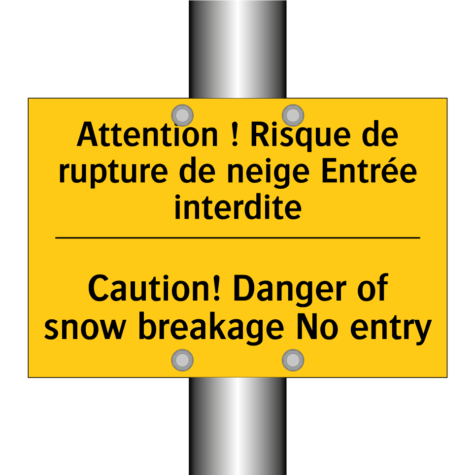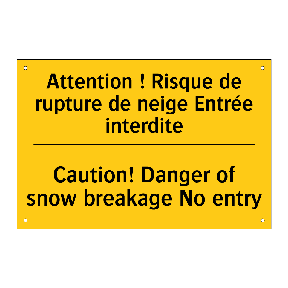 Panneau d'avertissement bilingue avec texte en français : "Attention ! Risque de rupture de neige Entrée interdite", et en anglais : "Caution! Danger of snow breakage No entry"