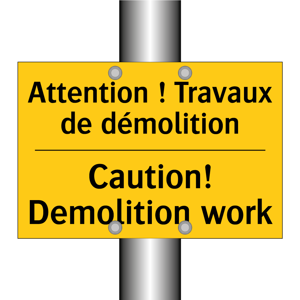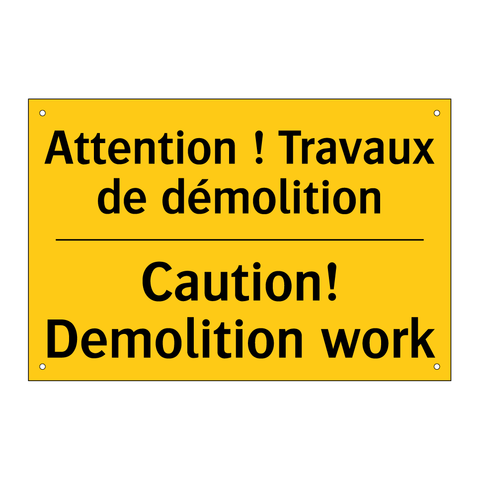 Panneau d'avertissement bilingue avec texte en français : "Attention ! Travaux de démolition", et en anglais : "Caution! Demolition work"